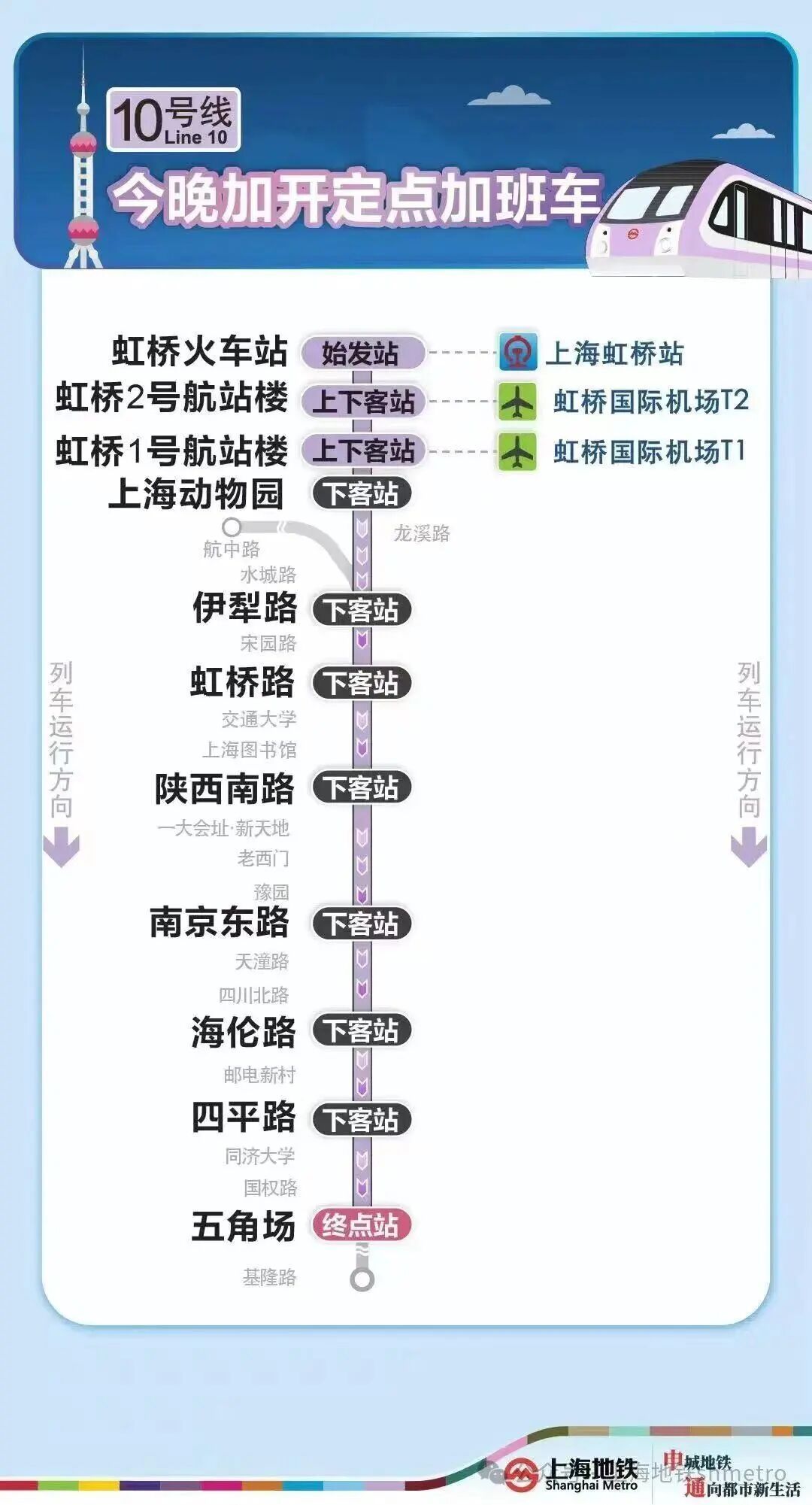 为满足春运期间乘客夜间出行需求,今晚(2月22日)2号线加开定点加班车,虹桥火车站站往龙阳路站加开至次日(2月23日)1时,10号线加开定点加班车,虹桥火车站站往五角场站加开至次日(2月23日)2时30分,17号线加开定点加班车,虹桥火车站站往西岑站加开至次日(2月23日)0时30分。定点加班车只停靠指定站点。