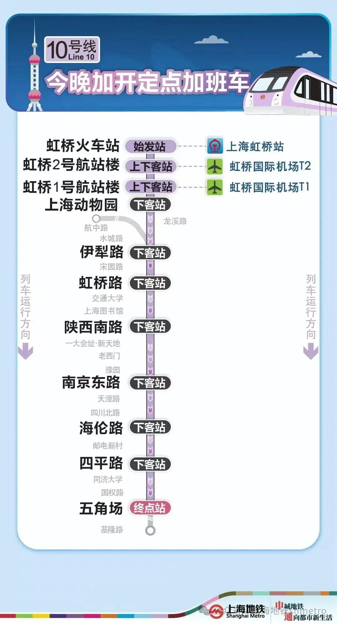 为满足春运期间乘客夜间出行需求,今晚(2月22日)2号线加开定点加班车,虹桥火车站站往龙阳路站加开至次日(2月23日)1时,10号线加开定点加班车,虹桥火车站站往五角场站加开至次日(2月23日)2时30分。定点加班车只停靠指定站点。