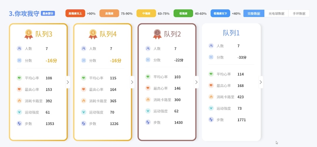 热身运动结束后,体育馆前方的大屏上实时显示每一队成员的平均心率、最高心率、消耗卡路里、运动强度等,并进行打分,“这一阶段,同学们的平均心率维持在每分钟120,达到了热身效果。”