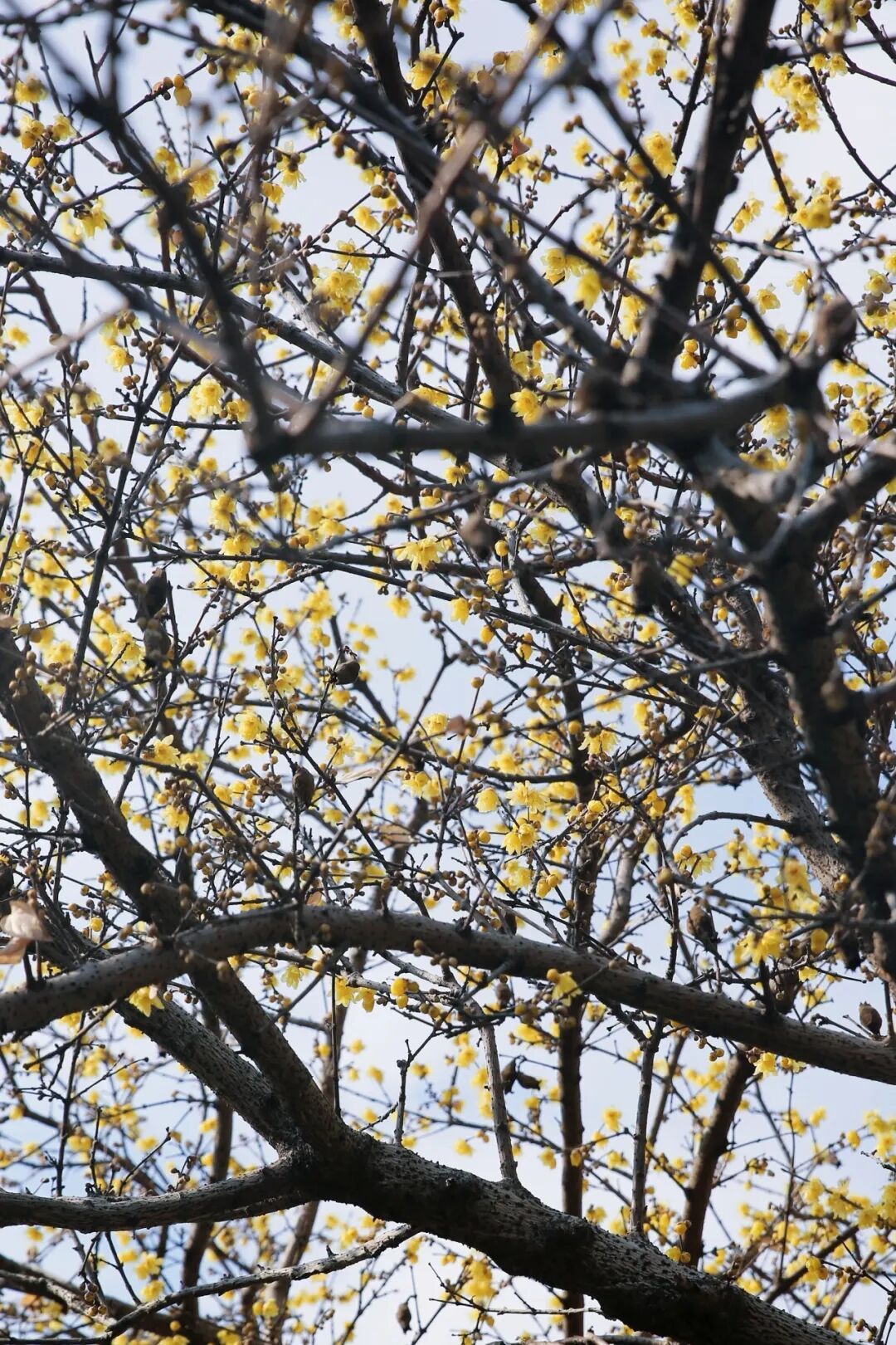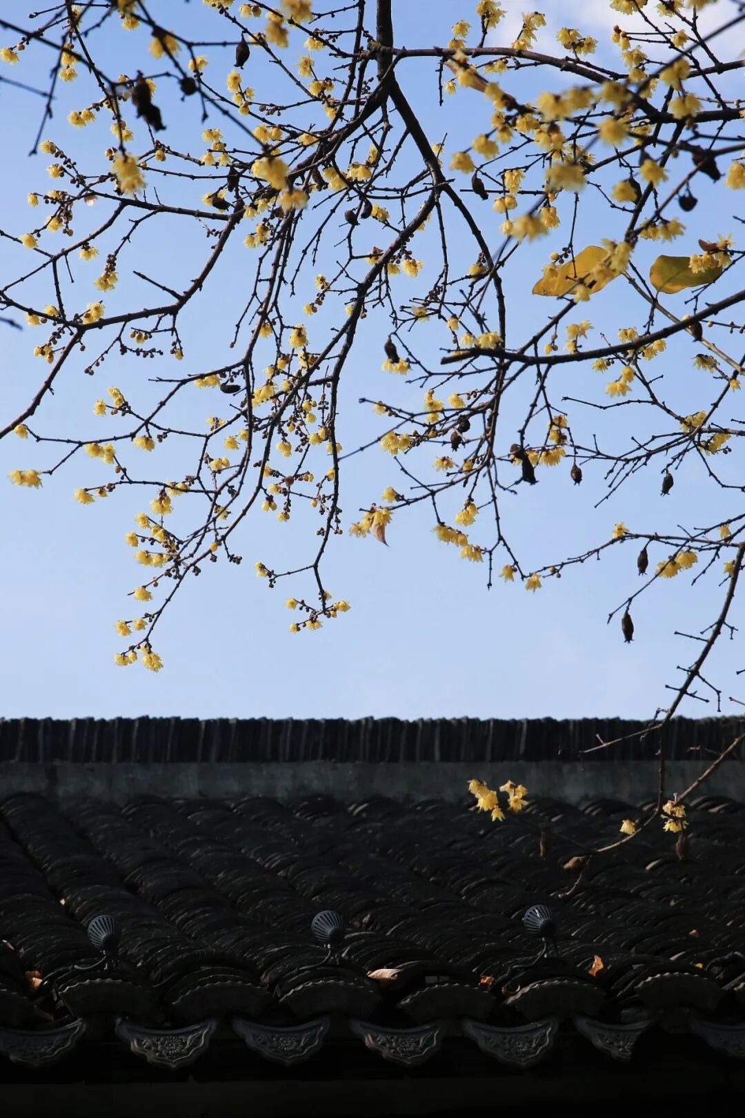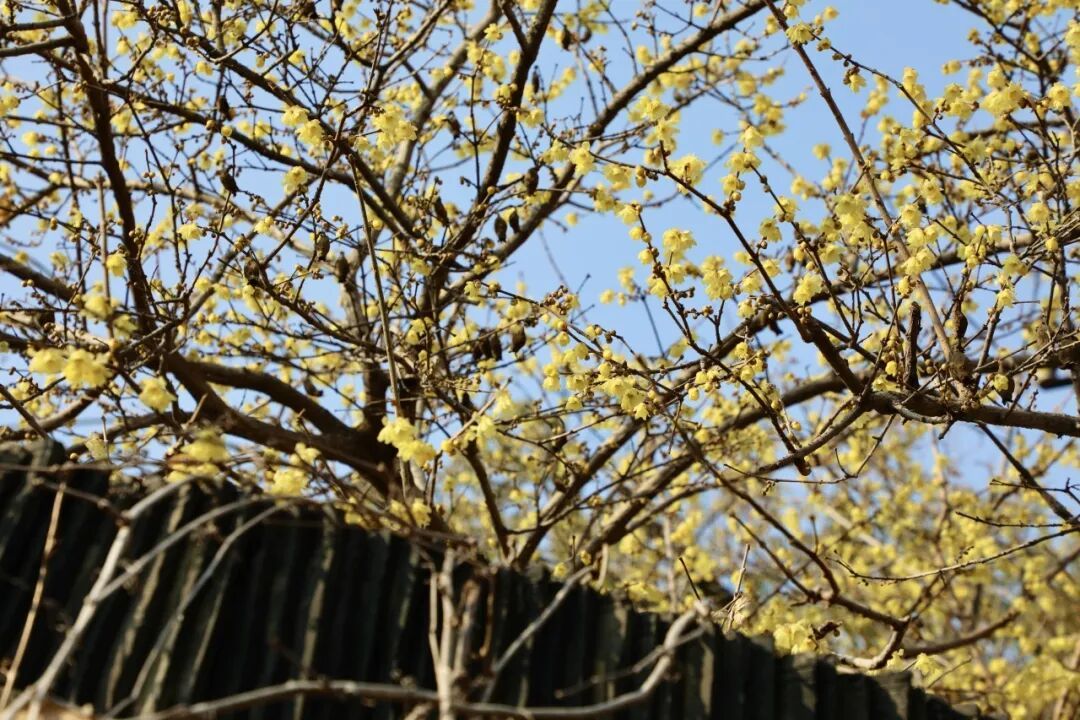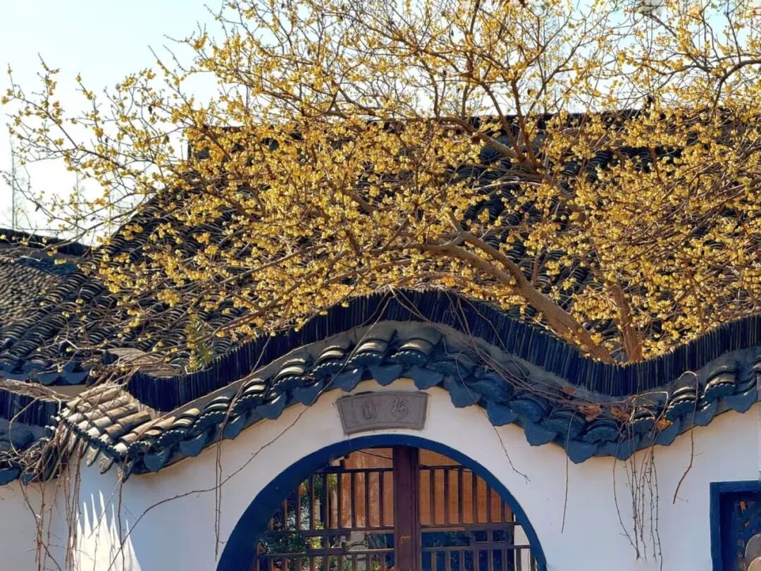 循着幽香移步换景,在梅园古朴的院墙边,或是望海楼翘角的飞檐下,金黄的蜡梅香气清甜,花骨朵簇拥在枝头,与老宅相映成趣。