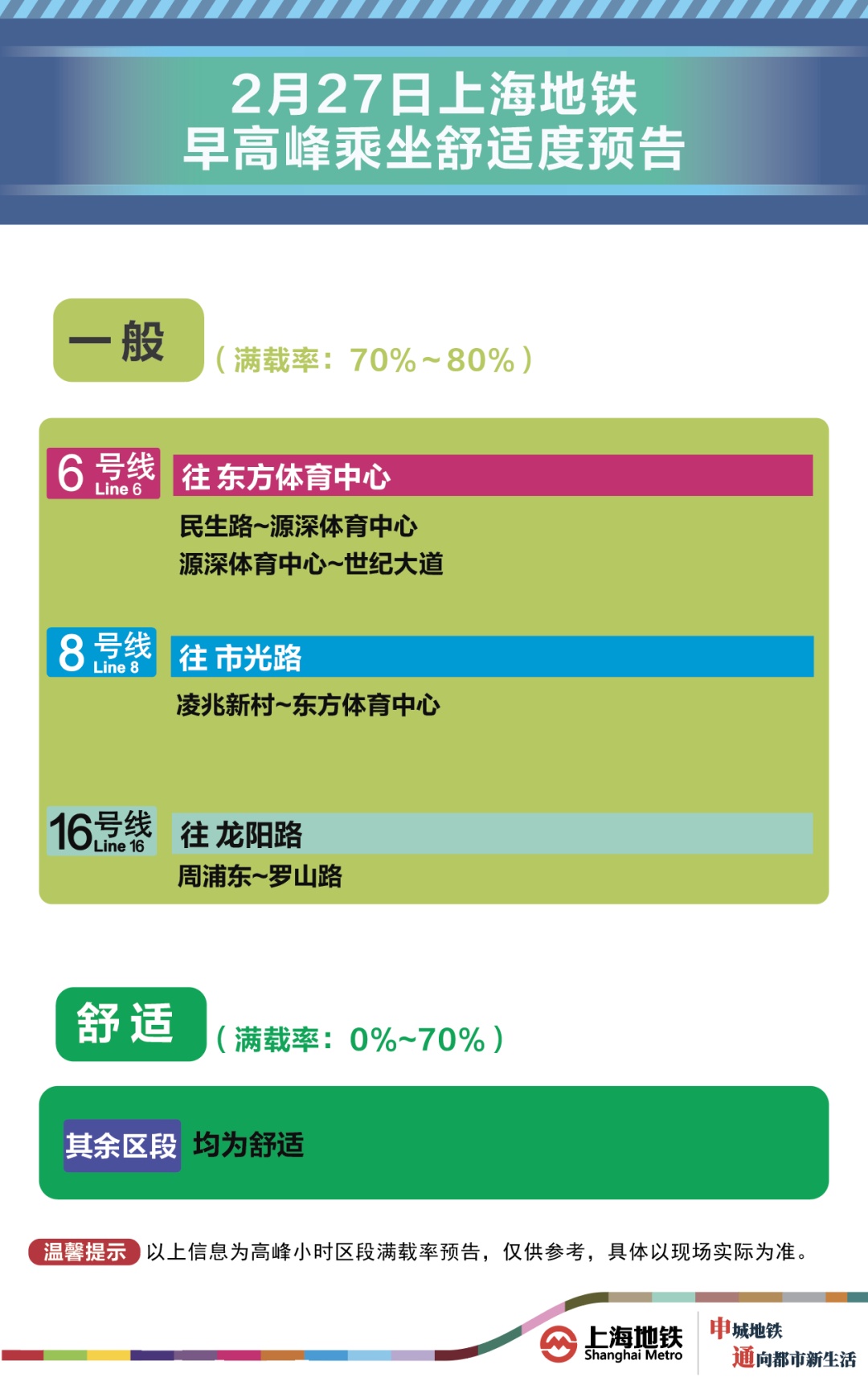 为提升上海地铁早高峰期间出行服务水平,提升乘客乘坐体验,上海地铁向乘客提供乘坐舒适度预告,方便乘客提