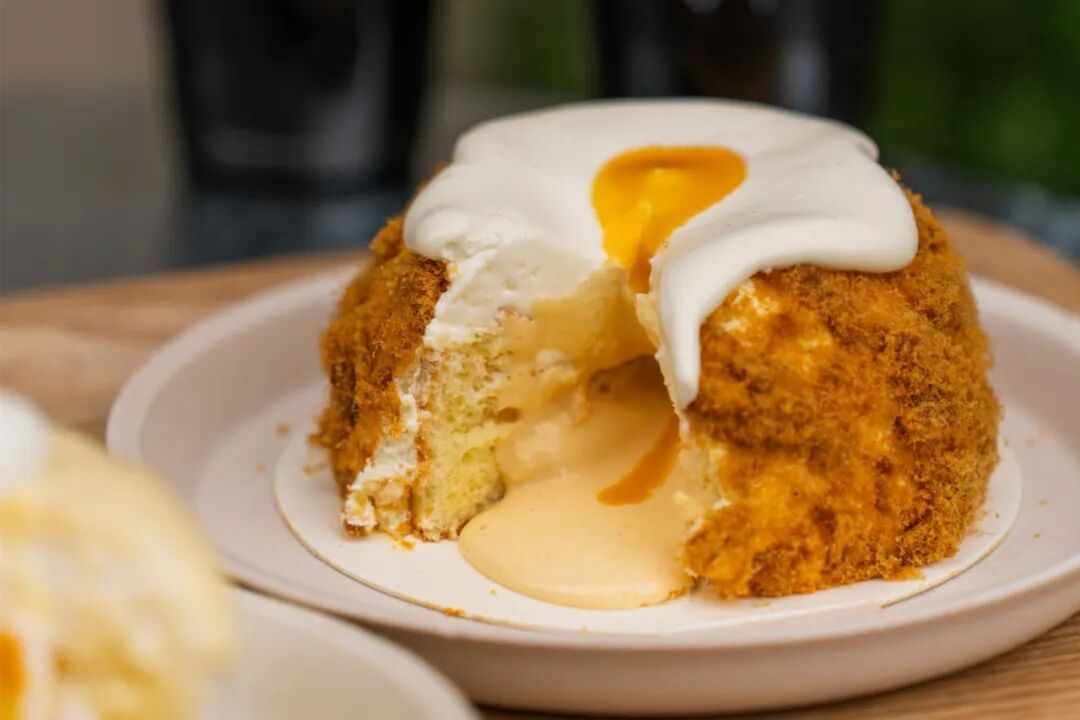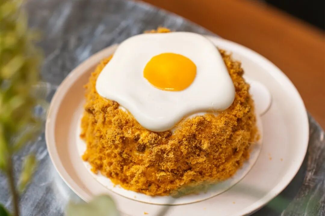 “流心蛋”选用上海消费者最熟悉的“立丰”松松融合咸蛋黄制成覆盖整个蛋糕表面的蛋黄松松。被丝滑奶油与蛋糕包裹的咸蛋黄流心,以“咸鲜”开场,“奶甜”收尾,十足复刻了本帮菜“甜上口,咸收口”的韵味。