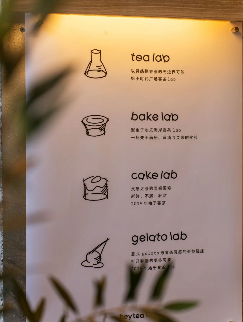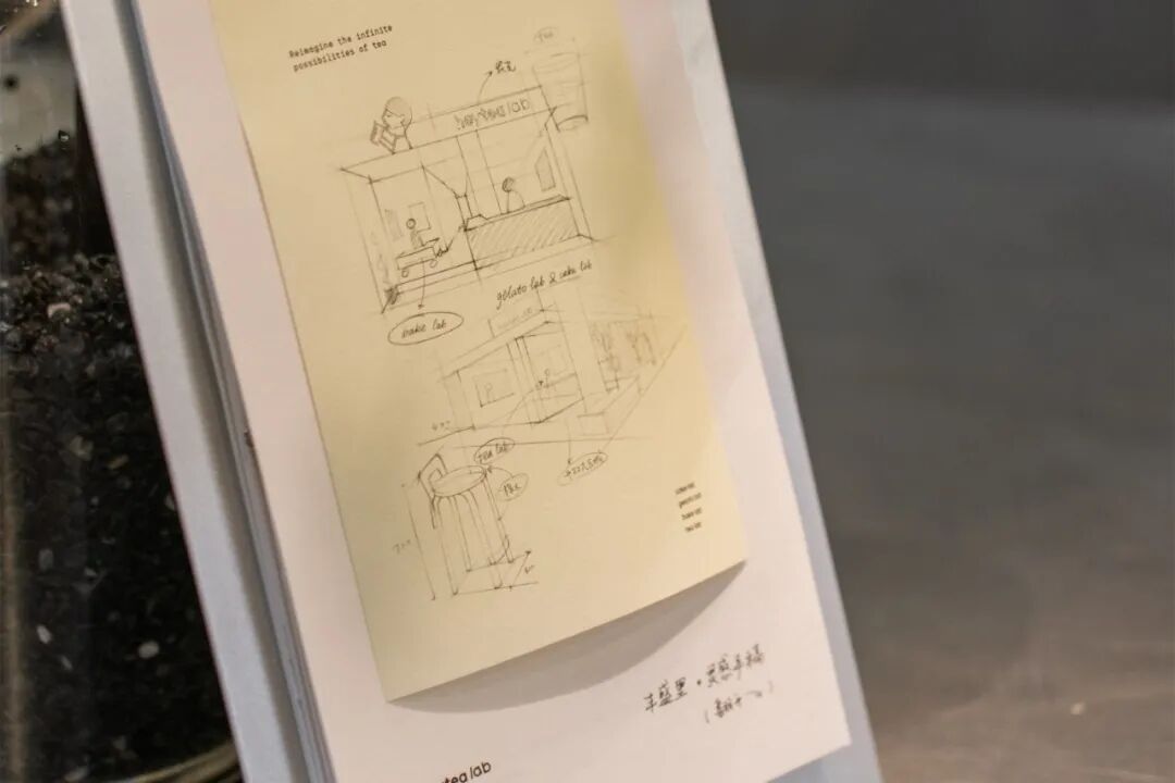 门店内,裸露的结构、原始的细节与原生的材料成为叙事主体,通过不规则线条与可移动板块的灵活组合,规划出tea lab、cake lab、gelato lab与bake lab之间流动的空间动线。大量与茶相关的实验手稿被集中陈列在店内,以轻盈、开放的表达方式呈现heytea lab实验性的“持续发生”。