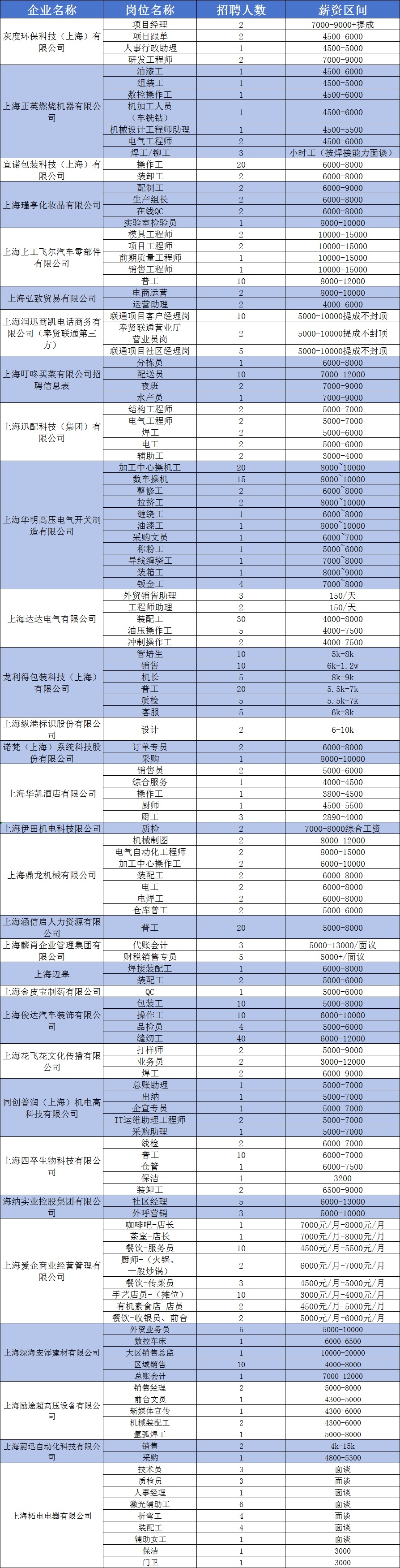 本次活动参会企业32家,招聘岗位包括普工、销售、手艺店员、配送员、经理、管培生、服务员、质检、客服、会计、厨工、运营、生产组长、设计、模具工程师、营业厅营业员、厨师、收银员、前台、助理、咖啡吧店长、仓管、采购等129个,招聘人数490人。