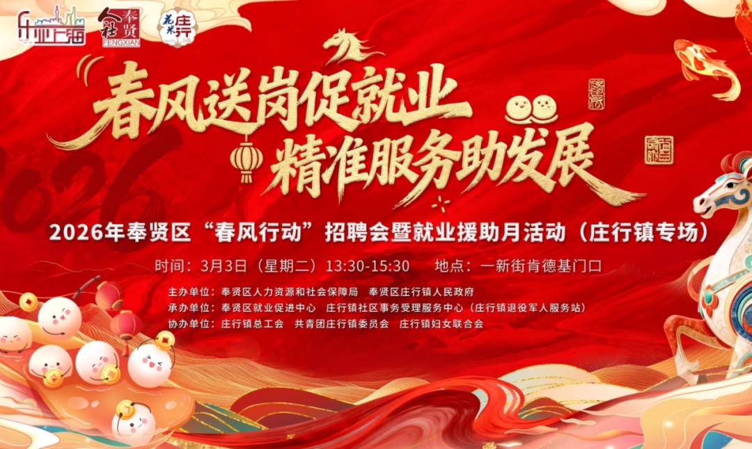 为更好促进高校毕业生和群众就业,满足企业用工需求,庄行镇将于3月3日(周二)13:30举行“春风送岗促就业 精准服务助发展”——2026年春季促进就业专项行动奉贤区“春风行动”招聘会暨就业援助月活动(庄行镇专场)。