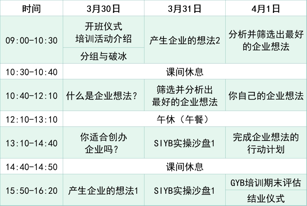 GYB培训介绍 产生你的企业想法(GYB):旨在帮助创业者了解什么是企业和企业想法,分析评估是否适合创业,掌握产生企业想法的方法,并筛选出适合自己的创业项目。 本次培训为期3天,培训课程不收取费用,拟招募有志于在普陀区自主创业的意向创业者,报名后需面试通过方可入学。 课程安排 点击查看大图,具体安排以实际情况为准 培训基本情况 培训时间 3月30日-4月1日 9:00-16:30 培训地点 长征镇怒江党群服务中心 (中江路875号) 报名方式 报名时间 即日起至2026年3月24日 报名方式 填写报名表并发送至邮箱 3353268316@qq.com 点击文末“阅读原文”,获取报名表 咨询电话 021-66118901 师资团队 凌菊 国家人力资源和社会保障部马兰花创业培训讲师 上海市创业指导专家 上海倚锋私募基金联合创始人 沪创聚创业指导创始人 上海市科创中心导师 上海市中小企业发展导师 国家注册会计师 吴一佳 国家人力资源和社会保障部马兰花创业培训讲师 上海市创业指导专家 普陀区人社局特聘“乐业专家” 上海略世管理咨询有限公司创始总经理 课程亮点 小班授课,深度参与 马兰花创业培训以小班授课的形式开展,通过互动式教学和成人教学方法的应用,让学员深度参与培训课程,引导学员在培训教学和实践活动中完成创业任务。 资深讲师,专业指导 马兰花创业培训讲师来自本市创业指导专家志愿团、创业孵化园区、各院校、各创业培训机构及各区人社部门的资深创业指导专家共同组成,具有丰富的创业实践和创业指导经验可为培训学员提供权威、专业、有针对性的创业培训辅导。 注重实践,持续跟踪 马兰花创业培训重视创业实践和可持续发展,通过整合各类创业服务资源,统筹推进创业培训与创业服务有效衔接,注重后续跟踪服务工作。对参训学员,我们依托本市公共创业服务体系,为其创业提供必要支持。在学员培训期间或培训结束后,我们将安排创业指导专家提供不少于1次跟踪指导服务,并从中遴选合适项目进行“创业新苗结对培育”。