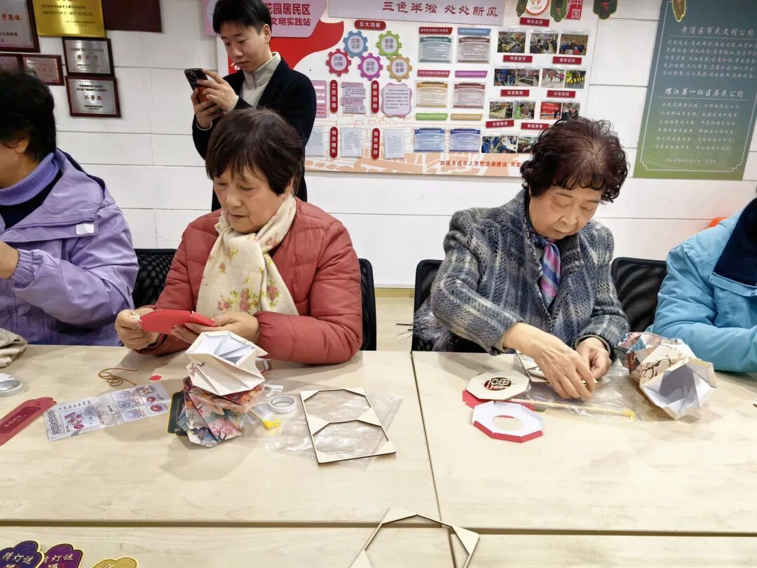 另一侧,做花灯与猜灯谜活动同步开展。彩色卡纸、流苏、灯谜条将现场装点得喜气洋洋。居民们发挥创意,亲手制作出兔子灯、莲花灯等精致花灯,孩子们提着成品花灯穿梭嬉戏,红绳系着的流苏在风中轻摇,似在诉说团圆的美好。灯谜区人头攒动,大家驻足思索、相互探讨,猜对谜底的居民收获红包奖励,喜悦之情溢于言表。