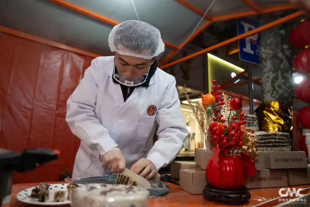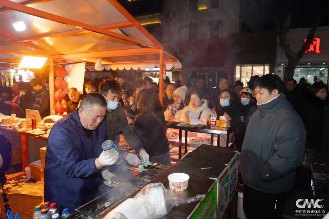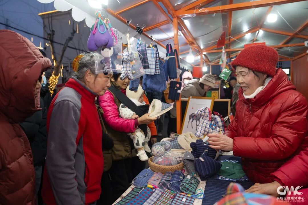 行街表演热闹非凡,街道两旁的互动体验区同样人气爆棚。在新华书店门前的“智趣灯谜长廊”,流光溢彩的灯笼下,不少市民拿起手机扫码猜谜。在“元宵民俗市集”,30多个摊位依次排开,崇明本土商品琳琅满目,非遗技艺展示摊位前围满了充满好奇的孩子。“元宵节特意给小朋友穿得漂漂亮亮出来玩,感受浓浓的节日氛围。”一位市民说。
