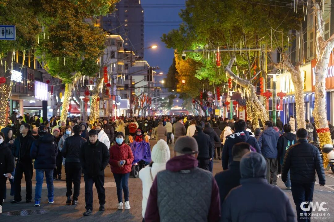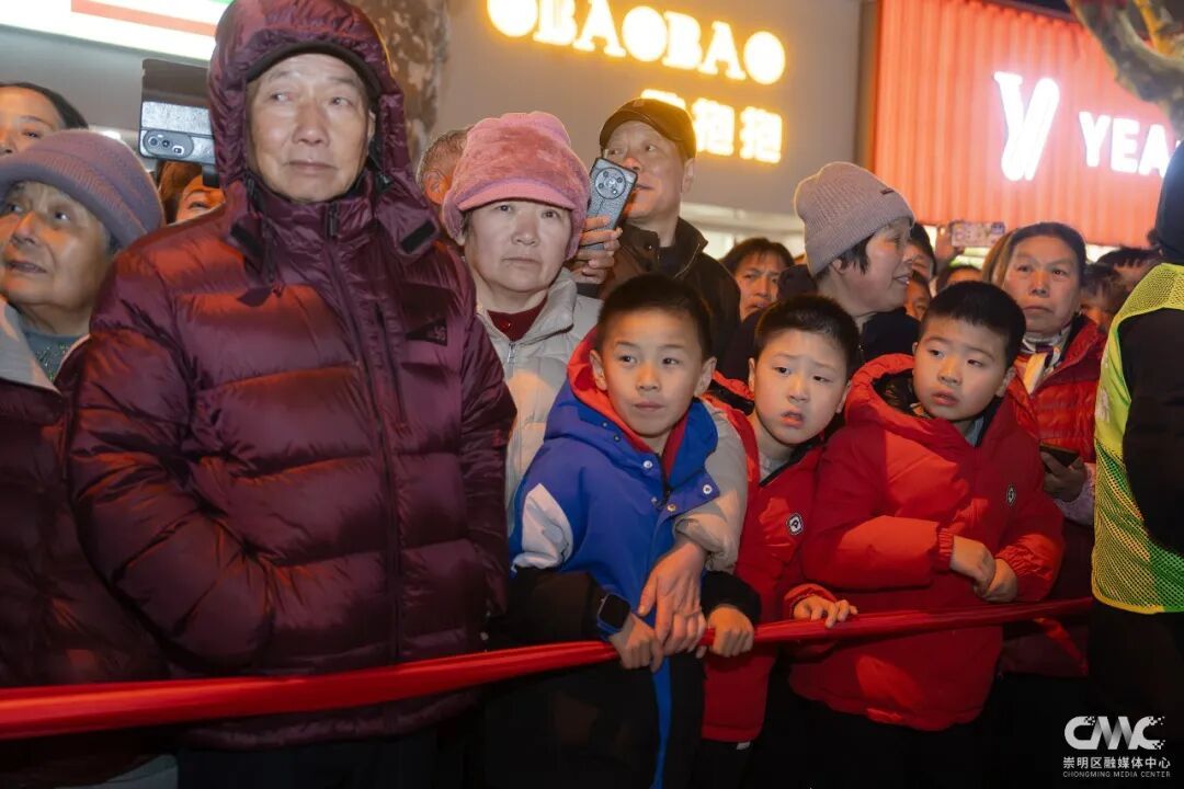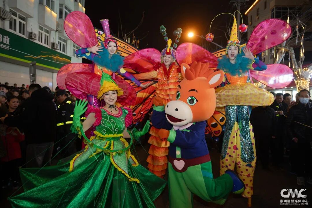 当晚6:30,伴随着铿锵有力的锣鼓声,民俗行街表演正式拉开帷幕。由150余人组成的表演队伍从北门路出发,沿八一路步行街一路向南行进,为市民呈现了一幅流动的民俗画卷。气势磅礴的舞龙舞狮队伍引得现场阵阵喝彩,憨态可掬的“福禄寿喜财”五神穿梭在人群中,将美好的祝福送给沿街商户和过往市民。而极具崇明本地特色的“掼田财”“牡丹亭”和“非遗跑马”表演,勾起了许多崇明人的温暖记忆。