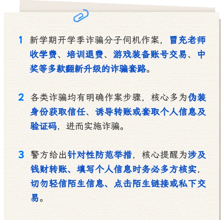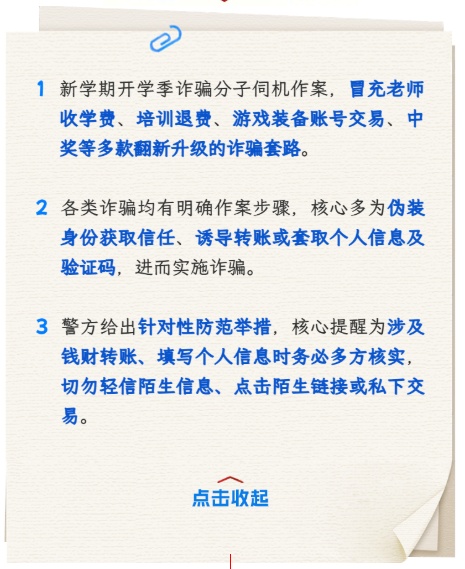 市公安局介绍,开学季诈骗分子瞄准了这一“黄金时机”,各类诈骗套路翻新升级,精准拿捏家长的焦虑心理和学生的防范盲区!一起来看看这份防骗指南! 开学季 防骗指南请查收 冒充老师收取开学费用诈骗 一、前期渗透:诈骗分子通过非法渠道购买家长联系方式、班级群二维码,或伪装成“新生家长”“转学生家长”申请加入班级社交群,入群后潜伏观察,记录班主任的昵称、说话语气、常用话术。 二、伪装身份:趁班主任或家委会成员不在线时,用相似昵称、盗用班主任头像,甚至PS班主任的工作证、缴费通知截图,制造 “官方身份”假象。 三、话术诱导:模仿班主任口吻发布缴费通知,话术精准踩中家长心理,同时,发布逾期可能无法正常办理入学手续等话术,制造紧迫感。 四、收款转移:发送的收款码多为个人二维码(非学校对公账户),部分更隐蔽的会用“第三方代收”借口,要求家长转账到指定银行卡,收款后迅速拉黑、退出班级群,消失无踪。 防范举措:任何缴费要求,先通过班级群公告、班主任私人电话(提前留存的官方号码)双重核实,绝不仅凭群内一条消息转账。 培训退费诈骗 一、精准筛选:诈骗分子通过非法获取的培训机构学员信息(包括姓名、家长电话、所报课程、缴费金额),针对性拨打骚扰电话。 二、引导操作:当家长确认后,以“退费需要走官方流程”为由,要求添加社交软件,发送“退费申请表”,或发送虚假 “退费链接”,要求家长点击链接登录并填写个人信息和银行卡信息。 三、实施诈骗:若家长填写了验证码,诈骗分子会直接通过快捷支付转走银行卡内资金;若仅获取了银行卡号和身份证号,会进一步以“账户冻结需要解冻费”“退费税率缴纳”等名义,诱导家长转账,完成诈骗。 防范举措:退费需通过培训机构官方App、公众号、线下门店或班主任通知,主动联系官方客服核实退费政策,绝不相信陌生来电的“主动退费”。 游戏装备 / 账号交易诈骗 一、诱饵吸引:诈骗分子在游戏内公屏、社交平台,发布“高价收号”“低价卖装备”信息,精准吸引学生群体。 二、诱导脱离平台:当学生主动联系后,诈骗分子会以“平台交易要收手续费”“私下交易更快捷”为借口,诱导学生脱离正规游戏交易平台,转到社交软件私聊。 三、诈骗闭环:若学生是买家:要求先付“定金”,称“付定金后发货”,收到定金后又以“账号绑定需要解锁费”“安全验证费”要求加钱,最后拉黑;或发送虚假“装备发货链接”,诱导学生点击盗号木马链接,盗走学生原有游戏账号。若学生是卖家:要求学生先解绑账号绑定、发送账号密码“验货”,收到账号后立即修改密码、绑定自己的手机,拉黑卖家拒不付款。 防范举措:游戏账号、装备交易必须通过官方认可的正规交易平台,签订交易协议,切勿私下微信、支付宝转账。 中奖诈骗 一、广撒网引流:诈骗分子通过短信、社交软件私信、短视频评论区等渠道,批量发送中奖信息,精准瞄准学生和家长群体。 二、身份伪装+信任铺垫:当学生或家长联系时,诈骗分子会伪装成“品牌客服”“活动专员”,提供虚假的“活动编号”“中奖公示链接”,部分还会发送PS的“中奖名单截图”“奖品实物图”,甚至能报出学生的学校、年级等信息(非法渠道获取),进一步降低警惕。 三、索要费用/信息实施诈骗:收费陷阱:以“手续费”“个人所得税”“快递保价费”“奖品激活费” 为由,要求转账到指定账户;信息窃取:发送钓鱼链接,要求填写姓名、身份证号、银行卡号、手机号及短信验证码,或诱导下载“领奖 App”(内含木马病毒),一旦填写或下载,银行卡资金会被直接盗刷,个人信息也会被倒卖。 防范举措:陌生短信、弹窗、私信的中奖信息一律不信,更不向陌生中奖活动泄露个人身份证号、银行卡号、短信验证码,不点击陌生链接,不下载非官方应用商店的App。 警方提示 请大家务必提高警惕 凡是涉及钱财转账 填写个人信息的 一定要先核实清楚 保护好自己的钱袋子 平平安安迎接新学期 责编:朱竞华、顾佳丽