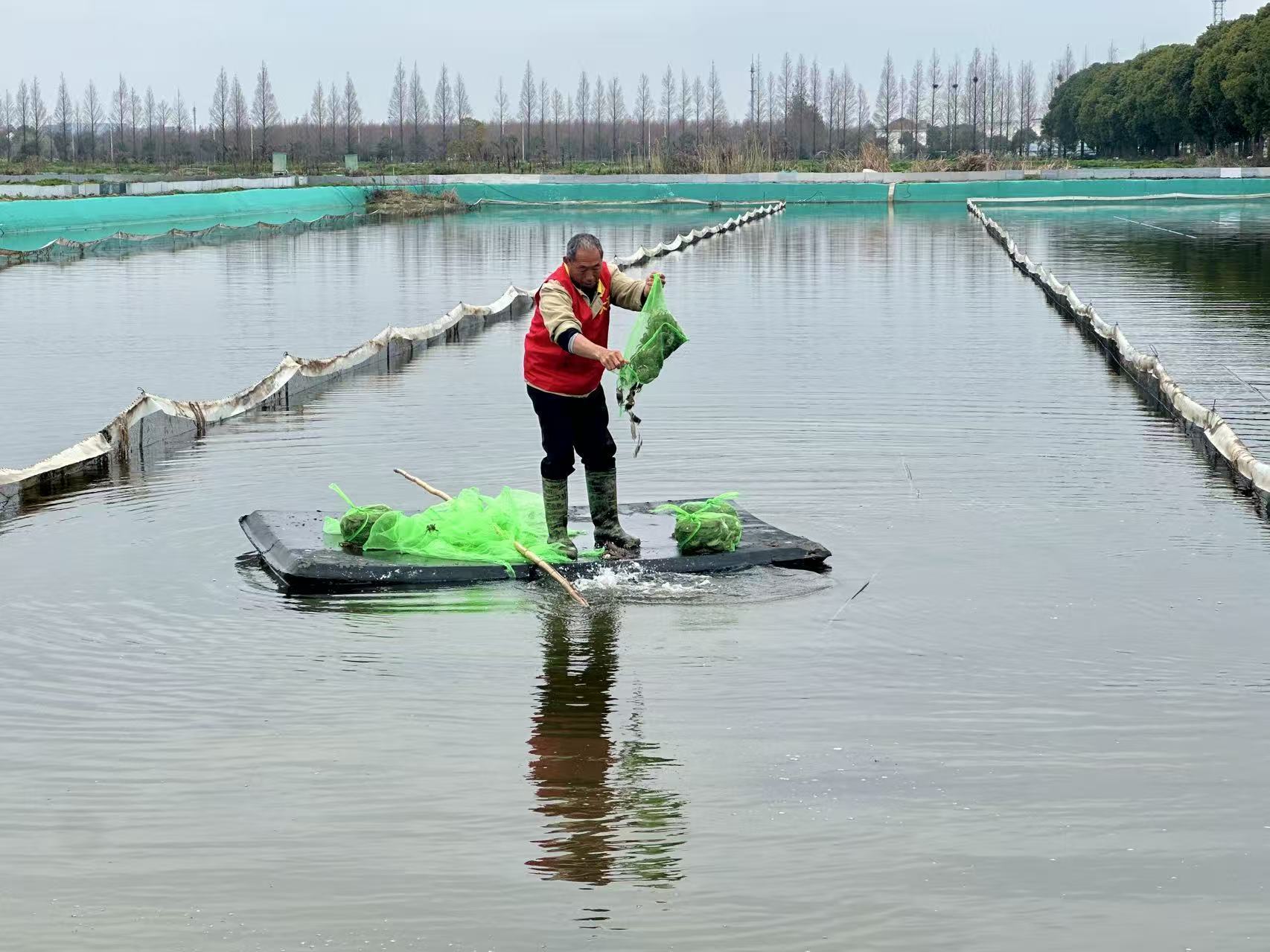 捞苗、分拣、入塘,工序一环接一环。一兜兜由挑蟹师傅“选拔”出的优质扣蟹,伴随着阵阵清脆的水声,迅速在塘底爬行,开启在“新家”的成长之旅。上海鱼跃水产专业合作社总经理顾怡告诉记者,合作社已经自主培育蟹苗10余年,积累了丰富的技术经验,以蟹苗投放为例,要趁干塘把水草种下去,投放前还要对池塘消毒,消灭寄生虫和致病菌,给蟹苗营造安全健康的生长环境。“蟹塘围网内外分别种着伊乐藻和轮叶黑藻,不但净化水质,还为河蟹提供了蜕壳、纳凉的场所。”