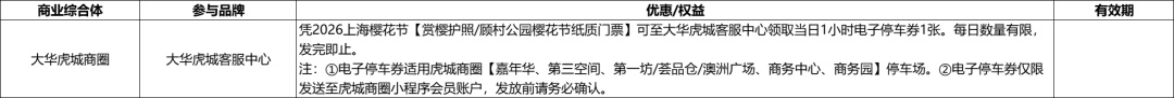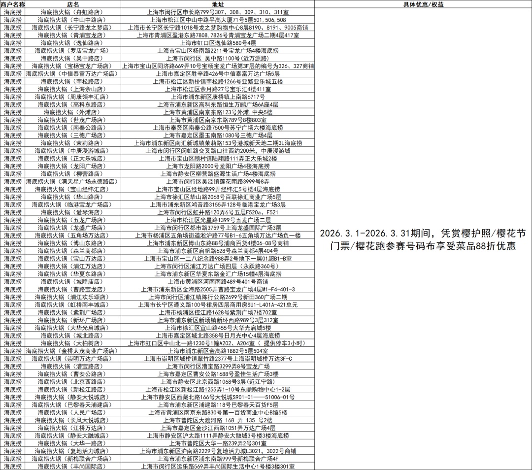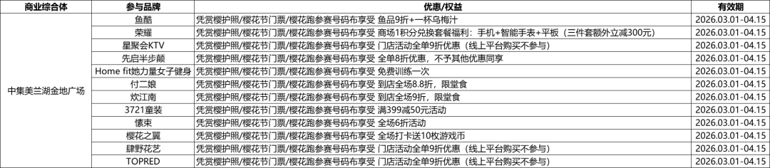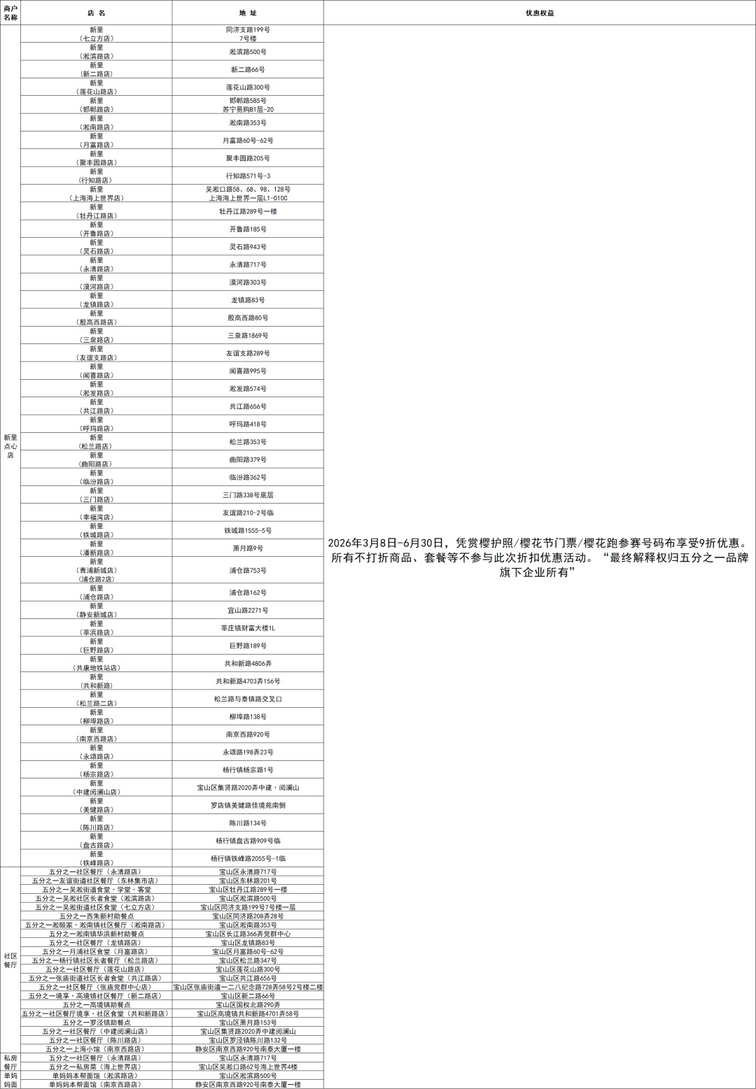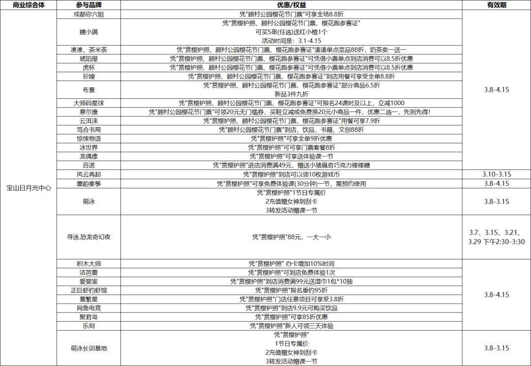 活动期间,持“赏樱护照”、顾村公园樱花节门票、“樱你而美”女子10公里精英赛参赛号码布等凭证,可享受以下众多商户的惊喜权益,畅享吃喝玩乐全方位的超值体验。