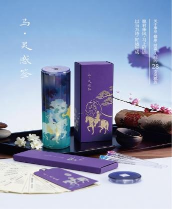 《马·灵感签》以少年策马之姿为形,融28个马年诗词意象于签筒。《马牌玉坠》,结合马主题诗句,使用「金木水火土」元素概念,赋予中国传统君子玉德的文化内核。《飞马流云锦囊》复刻古代「天马流云」砖刻纹样,织锦还原飞马驰骋的姿态,让非遗成为日常。扫描文创的NFC芯片,即可触发AI幻梦场景视频。