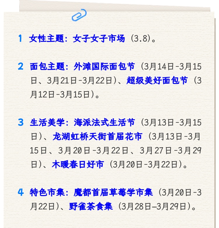 市文化旅游局介绍,3月的上海,最治愈的打开方式之一,莫过于逛一场充满烟火气的市集。面包香、茶香、花香、果香交织……每一场都藏着不一样的春日惊喜,快约上搭子,赴一场市集之约吧!