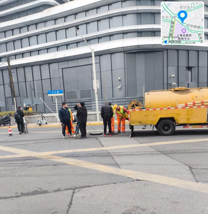 为缓解居民困境,各方力量持续发力,为管道疏通按下“加速键”。2025年2月,在天目西路街道和华丰居民区党总支的协调下,静安区市政工程和配套管理中心(以下简称市政中心)带领专业队伍,组织大规模专业疏通,暂时缓解了堵塞问题,并承诺随叫随到保障居民生活。