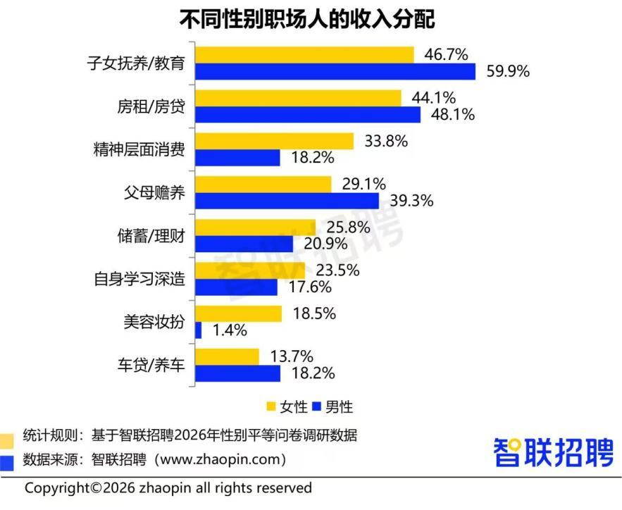 在收入分配上,女性呈现出更强的自我投资意识。数据显示,除“子女抚养/教育”“房贷/房租”“父母赡养”等生活刚性支出外,女性在精神消费(33.8%)、储蓄理财(25.8%)、学习深造(23.5%)方面的投入占比均高于男性。这种自我投资不仅是个人发展的长远规划,更是她们打破职场不平等、提升长期职业竞争力的重要策略。
