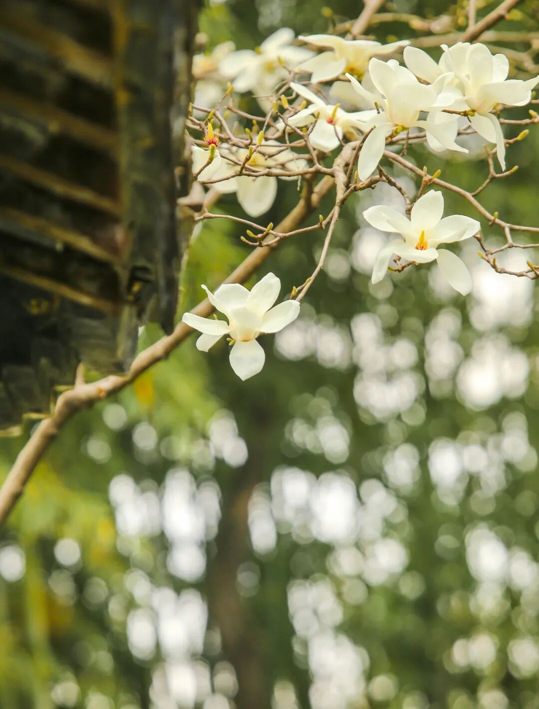 走近细看,朵朵玉兰花优雅而浪漫:有的含苞待放,犹如少女轻启的笑颜;有的盛开如白玉明珠,在春风中轻轻摇曳,仿佛云朵漂浮枝头。