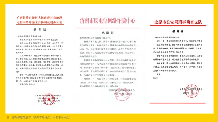 近期,静安区科技企业合合信息旗下启信宝陆续收到来自南京、济南、太原、广西壮族自治区等省市反诈相关部门的感谢信。致谢单位涵盖省级打击治理电信网络诈骗协调机构、市县级刑侦支队与新型犯罪研究作战中心等,体现出“科技反诈”工作在全国范围内广泛落地,警企双方共同守护人民群众的财产安全。