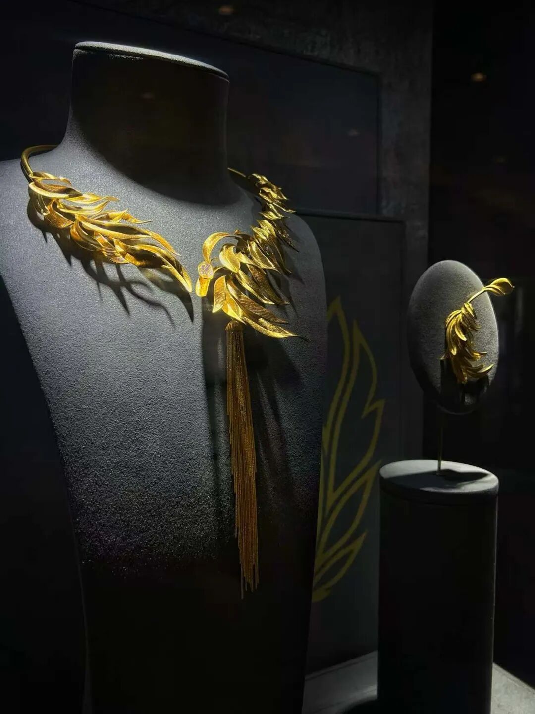 其中,《金翎凌空》以金色羽毛为灵感,捕捉金色羽翼划破长空的灵动瞬间,运用手工在黄金表面打磨出细腻而平行的丝线纹理,为首饰注入深邃的层次感与现代艺术气息,逼真再现羽毛在光影流转间如丝缎般的柔和光泽,仿佛让羽翼时刻处于轻盈翩飞的动态之中。