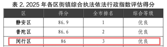 在日前公布的2025年度上海市街道乡镇综合执法依法行政指数评估排行中,闵行区位列全市第三、郊区第一,较2024年大幅提升8个位次。这份成绩单,不只是数字的跃升,更是闵行城管在探索人民城市建设中,用法治的精度和服务的温度,打开居民的心的一次生动实践。