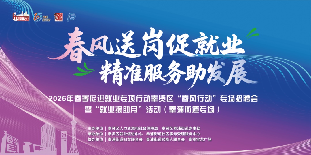 为进一步畅通求职招聘渠道,助力高质量就业与企业稳健发展,奉浦街道将于2026年3月14日(周六)13:00,在奉贤宝龙广场举办“春风送岗促就业,精准服务助发展”——2026年春季促进就业专项行动奉贤区“春风行动”招聘会暨“就业援助月”奉浦街道专场活动,现场搭建求职者与企业面对面双向交流平台。 还在找工作的小伙伴快看看有没有你心仪的岗位! 01 活动事项 组织活动 主办单位: 奉贤区人力资源和社会保障局 奉贤区奉浦街道办事处 承办单位: 奉贤区就业促进中心 奉浦街道社区事务受理服务中心 协办单位: 奉浦街道妇女联合会 奉浦街道残疾人联合会 奉贤宝龙广场 活动时间 2026年3月14日(周六) 13:00~15:00 活动地点 奉贤宝龙广场(上海市奉贤区航南公路5639号) 附近交通 奉贤15路、奉贤19路、奉贤29路、奉贤42路、航奉专线、虹桥枢纽5路、南航线、浦卫线、上奉专线、莘南专线(环城东路航南公路站) 轨道交通5号线(环城东路站) 温馨提示 求职者可自备多份个人求职简历,留给现场意向企业。 在求职过程中有迷茫的求职者可带好个人求职简历或者项目计划书,到现场公共就业咨询服务台进行职业指导或创业指导咨询。 招聘会期间,请您保管好随身携带物品。如需帮助,可前往现场签到台咨询。 咨询电话 67109680 春风送岗促就业 精准服务助发展