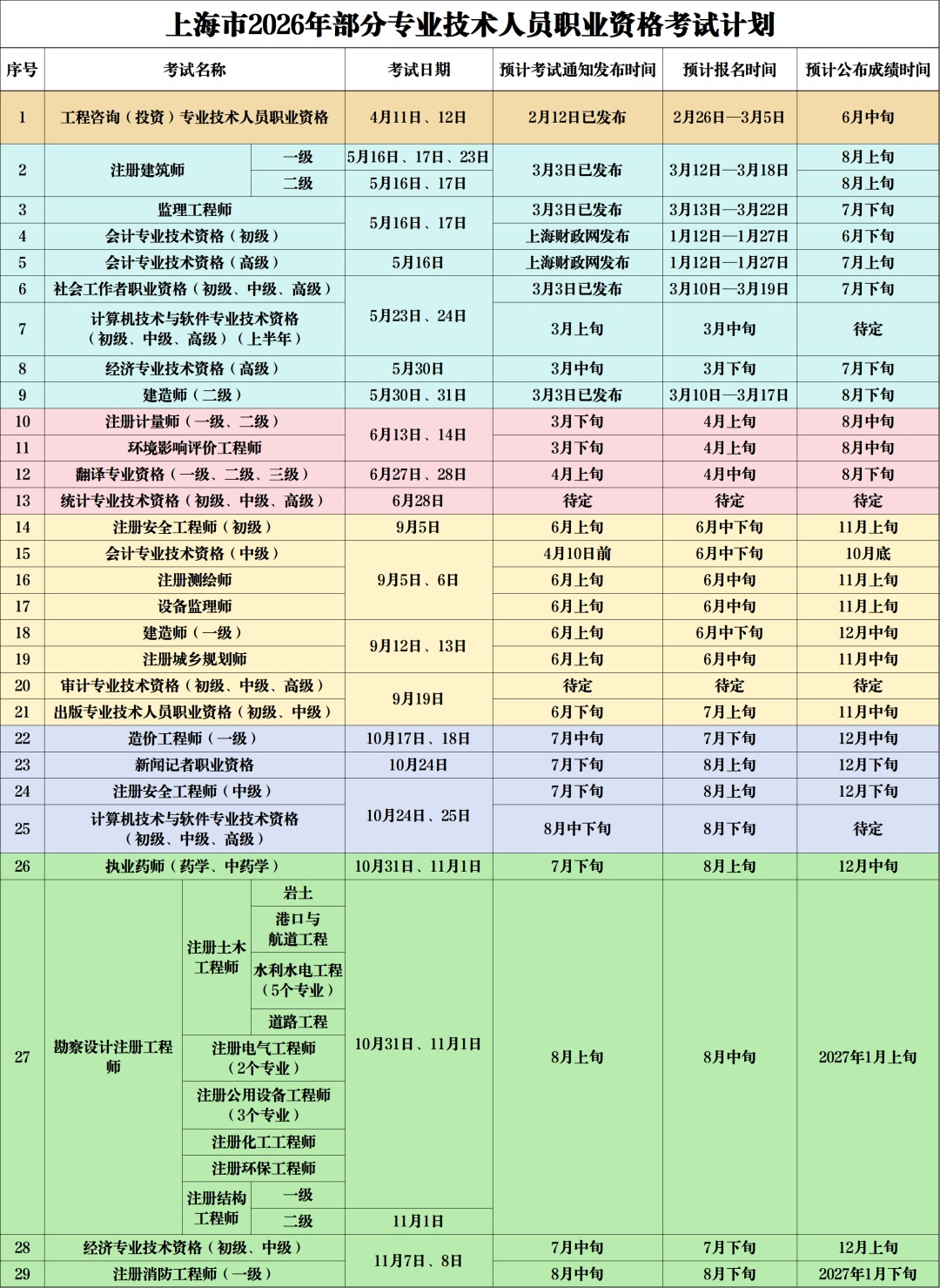 1、考试报名具体时间和要求以本市考务工作安排通知为准,广大考生可关注上海市职业能力考试院(rsj.sh.gov.cn/spta.shtml)“考务安排”和“考试项目”栏目有关信息(会计专业技术资格考试信息在上海市财政局官网www.czj.sh.gov.cn公布)。如遇特殊情况需要调整考试安排的,将另行通知。