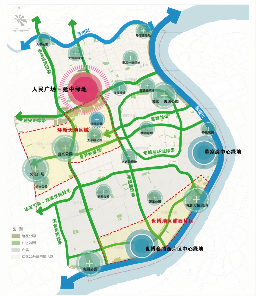 一核引领,以延中绿地为景观核心,打造一条森系生态游廊,形成空间连贯的中央生态绿核。两区联动,世博地区浦西片区打造功能复合、全龄友好的滨江公共空间;环新天地区推进淮海公园升级改造。多廊织网,以南浦地块绿色生态空间建设为抓手,贯通外滩-董家渡-黄浦滨江生态廊道。推进复兴中路衡复风貌带、瑞金南路生态景观带、老城厢环城绿带、方浜路-昼锦路蓝绿丝带等建设。多点渗透,完善综合公园、社区公园、口袋公园、立体绿化及单位附属绿地点位。