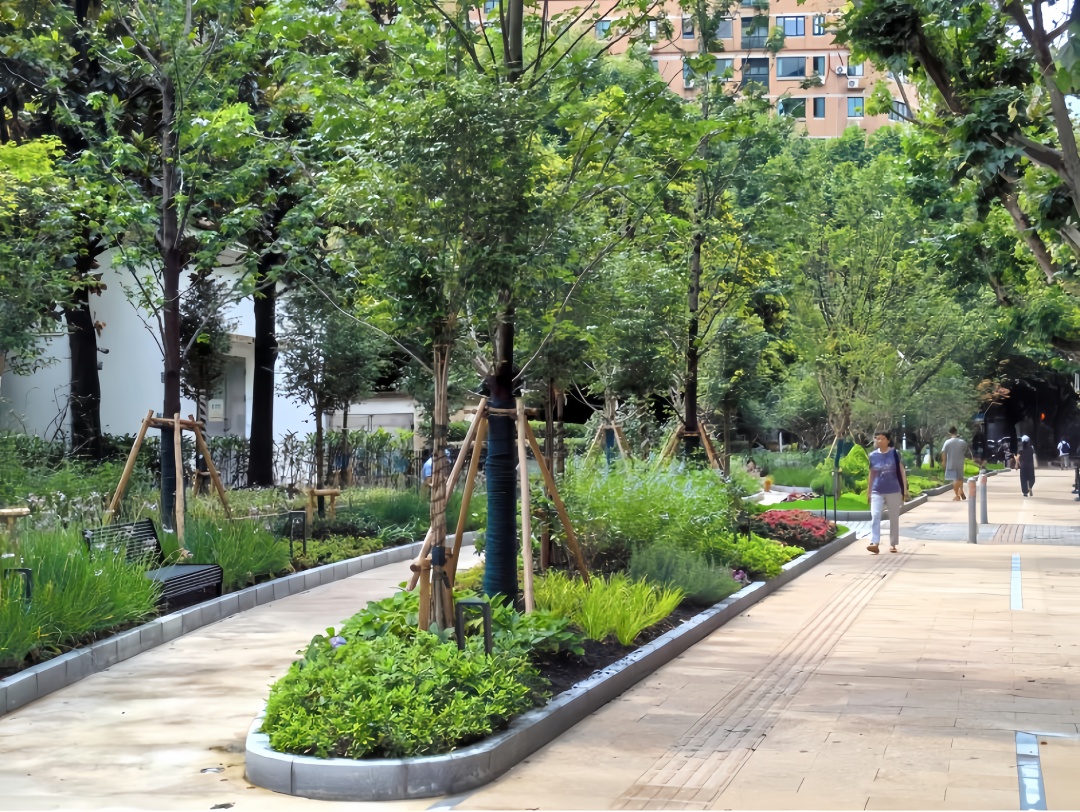 从开放共享附属绿地,打造口袋公园的绿色节点,到建设行道树连接带线性生态空间,以及挖潜垂直空间生态价值,鼓励墙面、阳台、檐口绿化、公共建筑的“类公园”立体界面,来形成“地面立面联动、室内室外无界”的街区绿色网络。