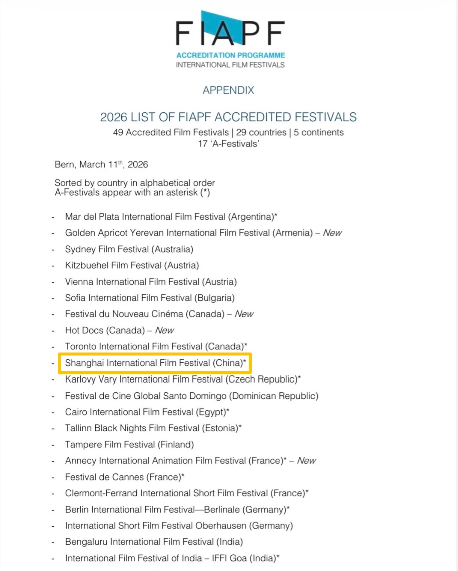 上海国际电影节入选FIAPF首批全新“A类电影节”名单
