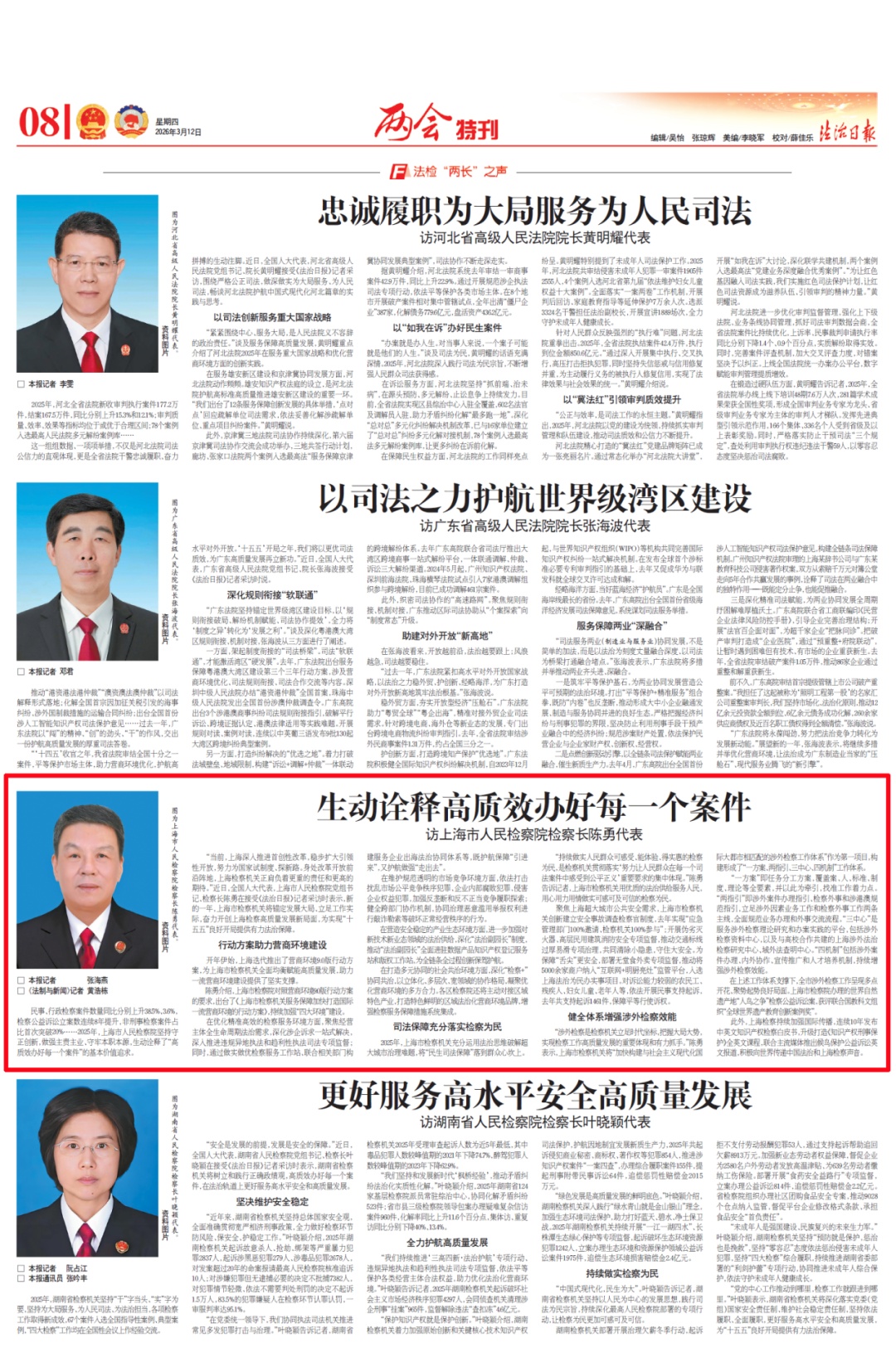 “当前,上海深入推进首创性改革,稳步扩大引领性开放,努力为国家试制度、探新路。身处改革开放前沿阵地,上海检察机关正肩负着更重的责任和更高的期待。”近日,全国人大代表,上海市人民检察院党组书记、检察长陈勇在接受《法治日报》记者采访时表示,新的一年,上海市检察机关将锚定发展大局、立足工作实际,奋力开创上海检察高质量发展新局面,为实现“十五五”良好开局提供有力法治保障。