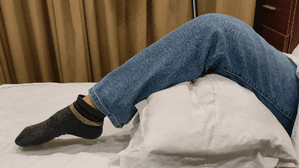 用被褥或枕头垫在膝盖后方,使膝盖位置尽量高于胸口,随后用力勾起脚尖并绷紧肌肉保持5秒,再绷直脚尖保持5秒,一勾一放为一次,每日做50次,锻炼至大腿肌肉发酸即为有效。