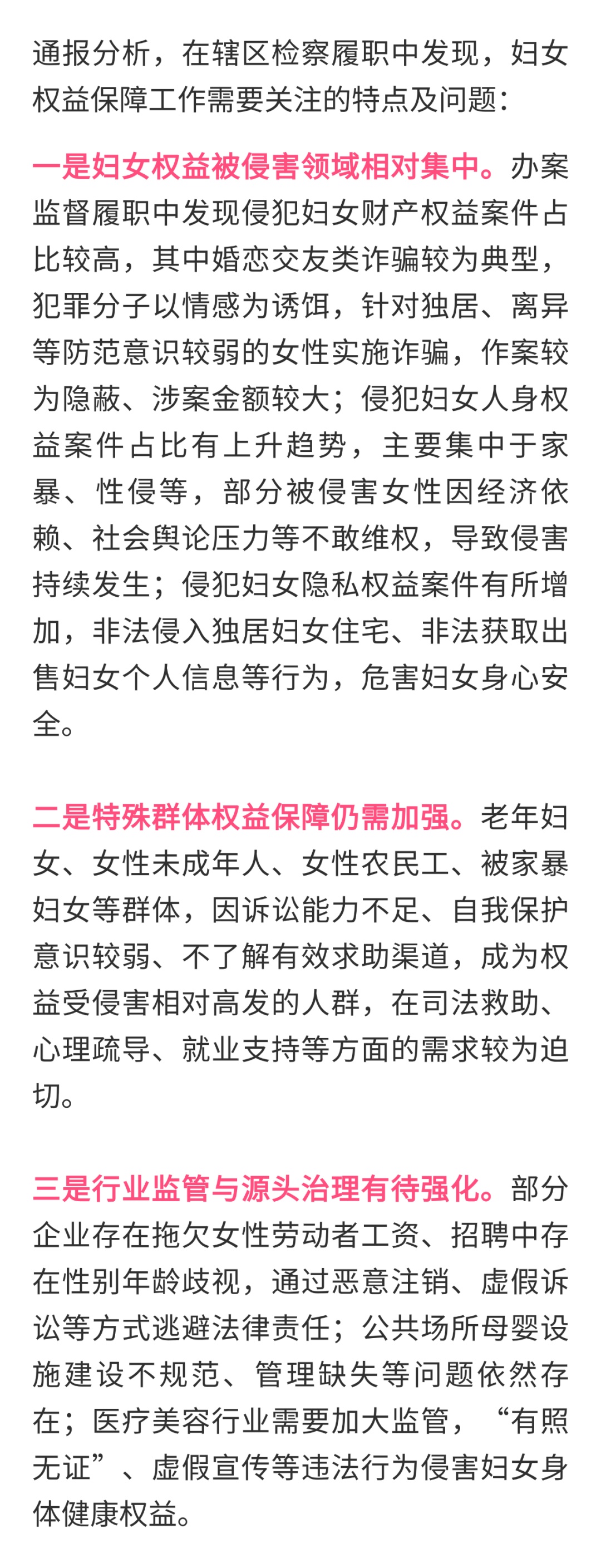通报称,近三年,杨浦区检察院依法办理侵害妇女权益刑事案件590余件,受理涉妇女权益保障民事行政诉讼案件370余件,覆盖劳动合同、婚姻家庭、继承、侵权责任、民间借贷等多个与妇女生活密切相关的领域。对困难妇女精准开展司法救助,救助120名女性被害人及申请人,累计发放国家司法救助金170余万元,切实帮扶因案陷入生活困境的妇女纾困解难。公益诉讼方面,该院聚焦公共场所母婴设施保障、网络医疗美容、平等保护劳动权等重点领域开展专项监督,排查相关场所及经营主体80余家,督促整治违法行为,以有力检察之为守护妇女合法权益。