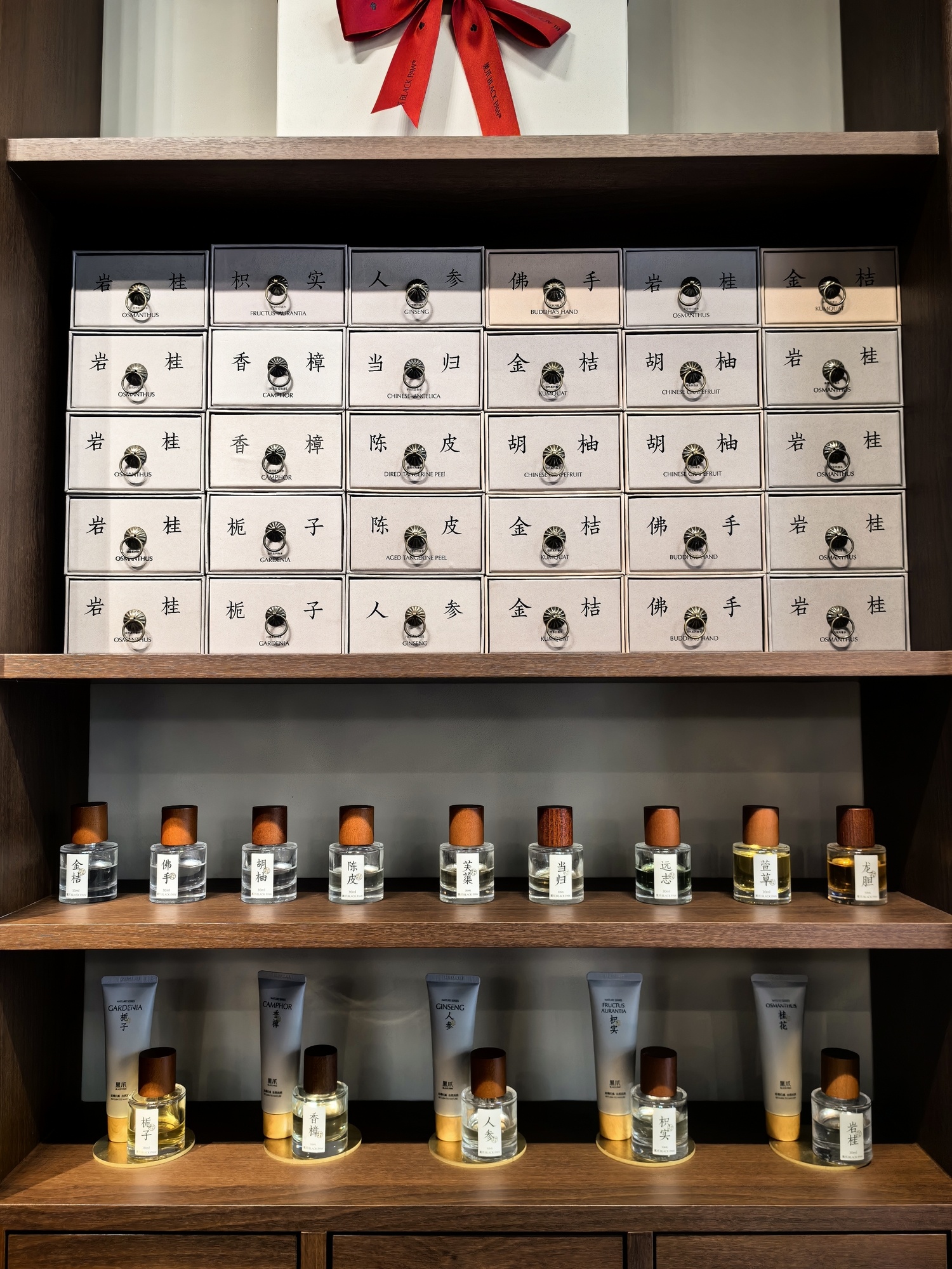 店内一侧,香水陈列如同中药铺的百眼柜。一个个包装盒如“抽屉”堆叠,标签上写着“当归”“人参”“枳实”……黄菁说,东方本草入药,也入香,“黑爪”把香水当成一味味药材,等待懂它的人来抓方。香水在这里,像可以治愈记忆的药。