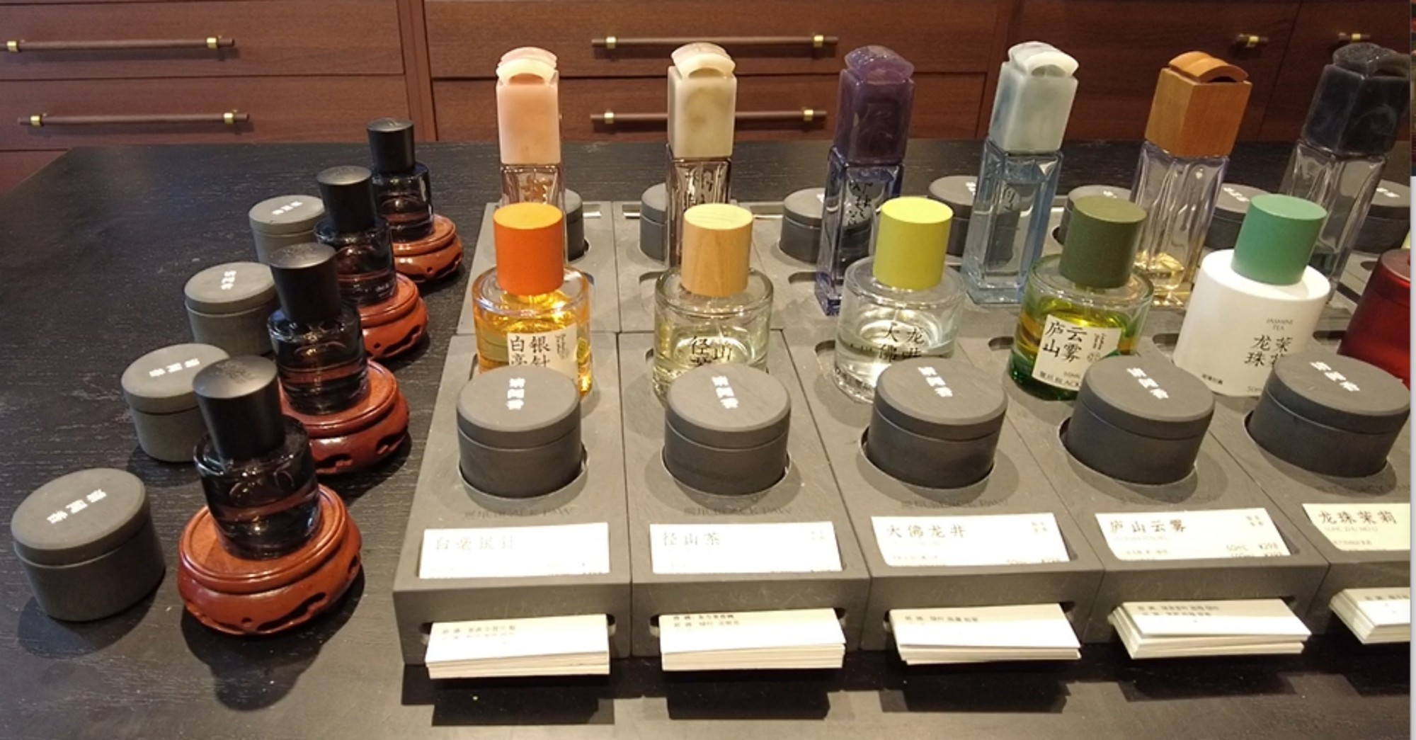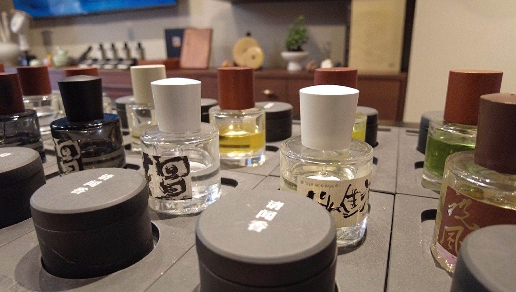 走进店内,这里的试香装置透着东方式讲究。闻香用的是砚台,香水滴入砚池,如墨色般沉静。
