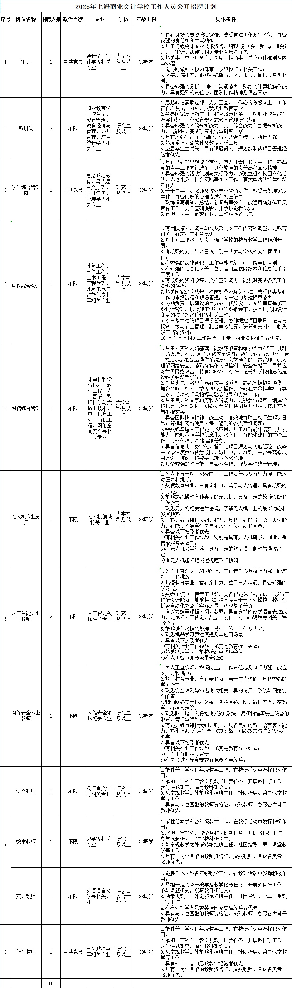 上海商业会计学校创建于1962年,是上海市经济和信息化委员会下属的一所公办国家级重点中专、首批上海市中等职业学校教学改革特色示范校。目前全日制在校生近2800余名,因教育发展需要,根据《上海市事业单位公开招聘人员办法》(沪人社规〔2019〕15号)文件精神,按照公开、平等、竞争、择优的原则,现面向社会公开招聘工作人员15名,公告如下: