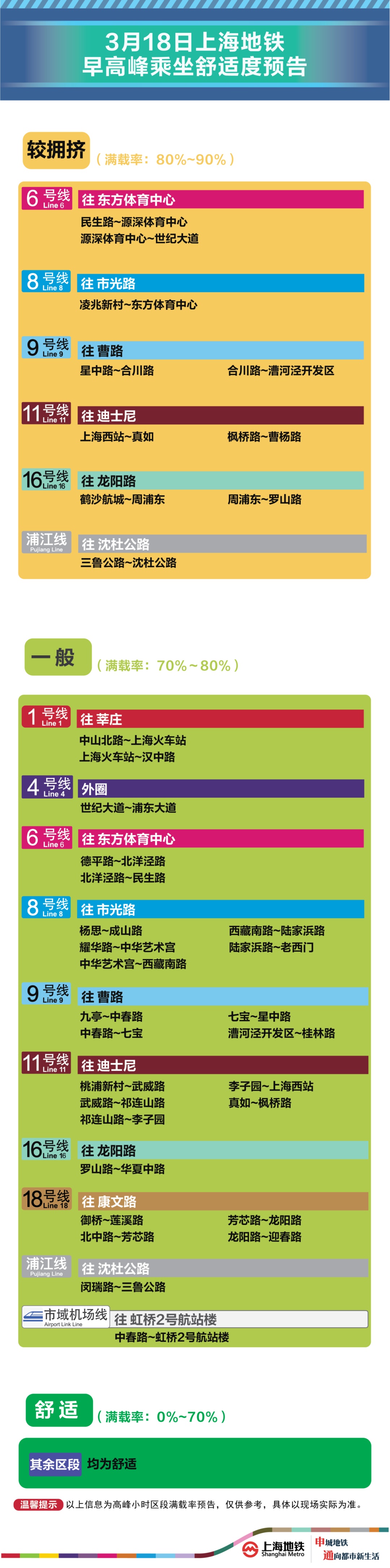 为提升上海地铁早高峰期间出行服务水平,提升乘客乘坐体验,上海地铁向乘客提供乘坐舒适度预告,方便乘客提