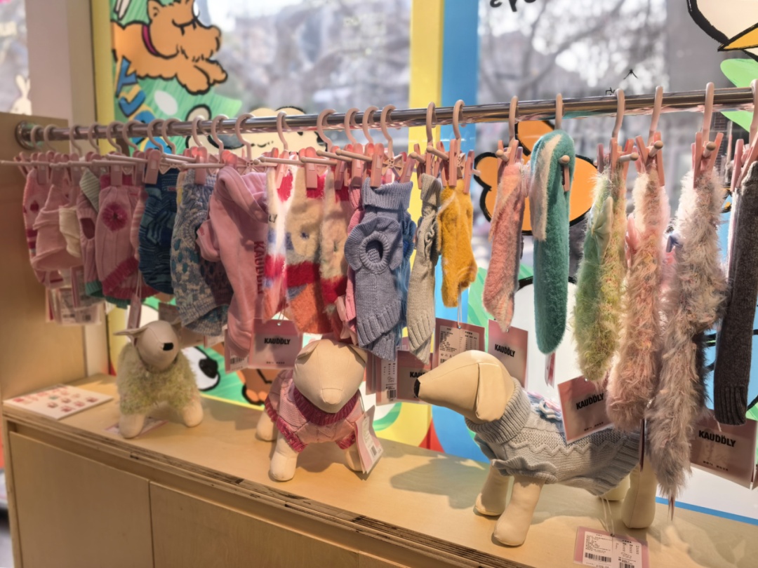 另一侧的KAUDDLY区域,则摆放着卫衣、高领毛衣等宠物服饰,搭配逼真的宠物模型,直观展示出上身效果。“我家猫特别怕穿衣服,但这件针织衫看起来很柔软,想带回去试试。”市民张女士分享。