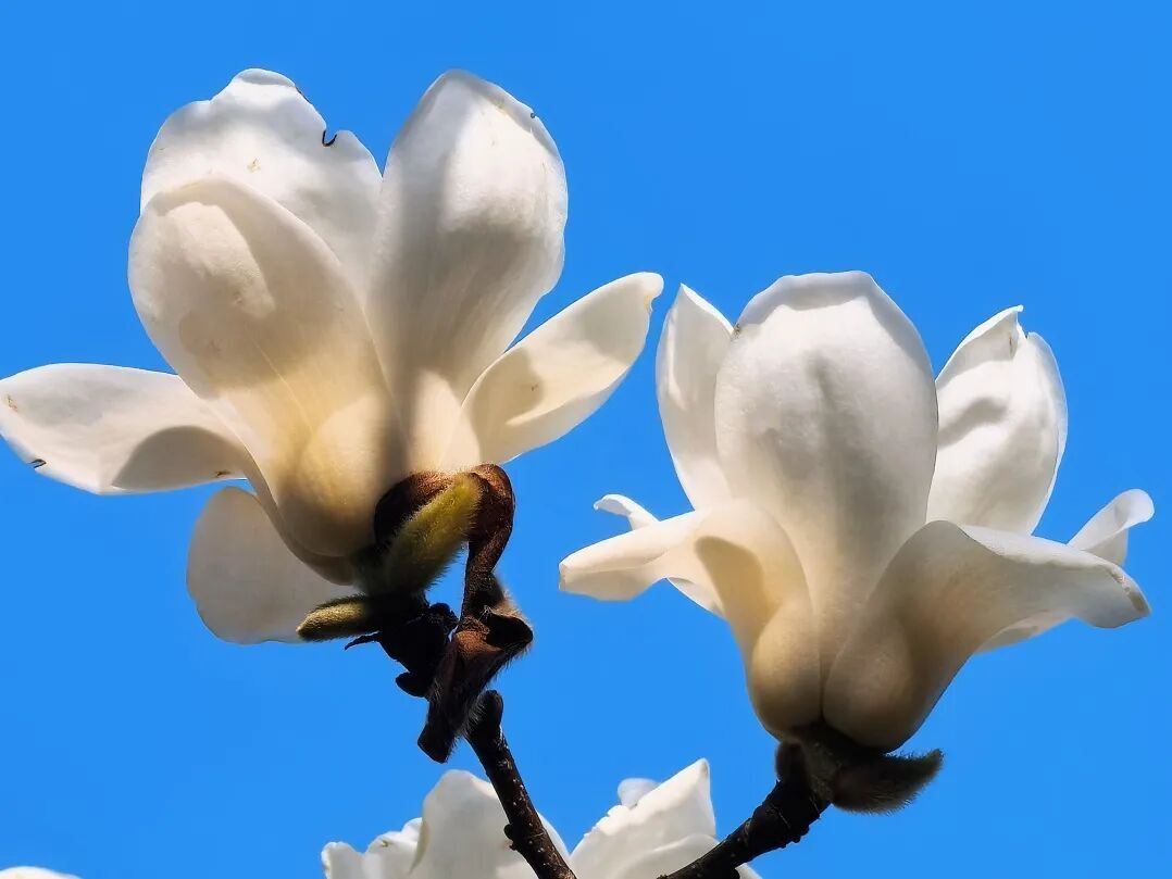 “霓裳片片晚妆新,束素亭亭玉殿春。”白玉兰花朵大而洁白,在春日阳光下宛如停驻枝头的白鸽。二乔玉兰、飞黄玉兰等也都在陆续绽放。