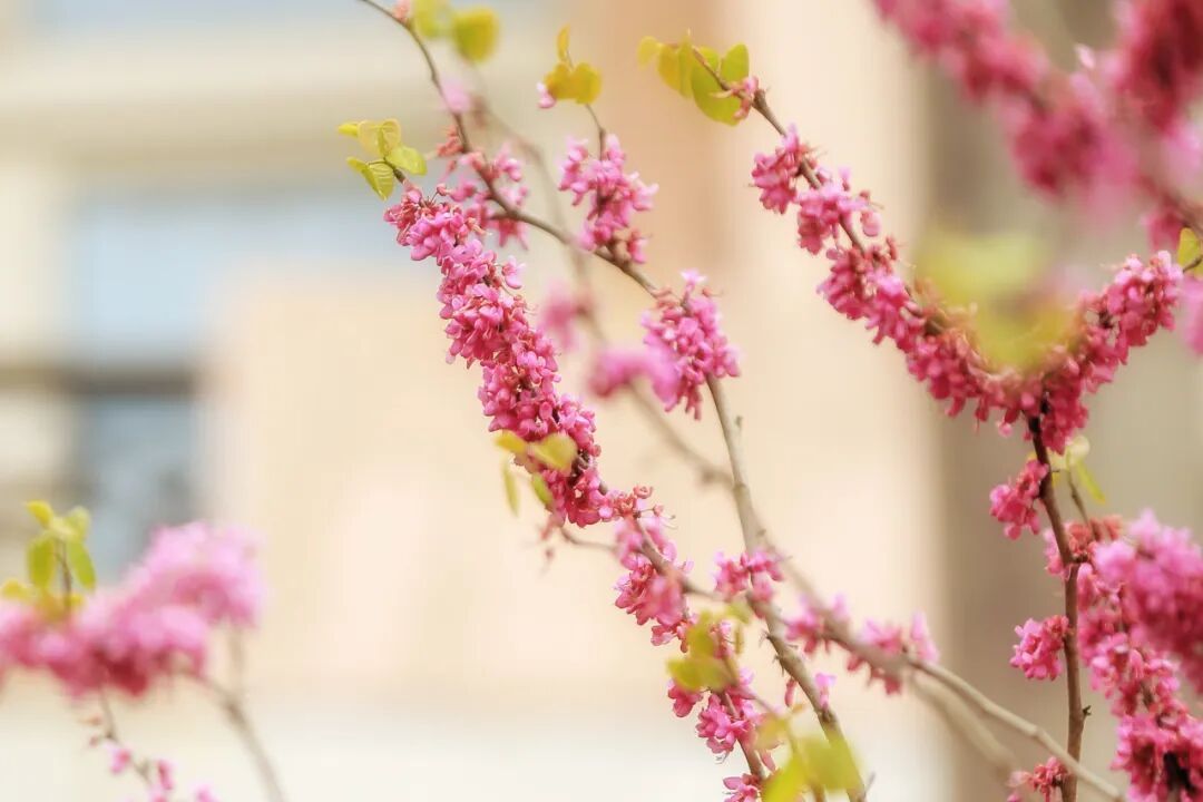 “杂英纷已积,含芳独暮春。”紫荆开在暮春,它的花朵团团簇簇地紧贴枝丫而开,颜色艳丽,似乎想要把春天留住。
