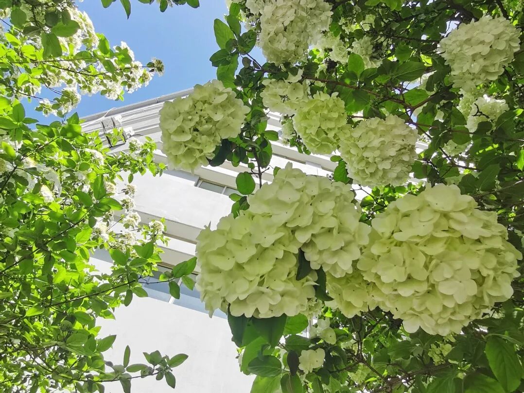 “高枝带雨压雕栏,一蒂千花白玉团。”木绣球的小花聚集在一起形成了硕大的花球,又因其绿白的颜色,给人雪球满树的感觉。