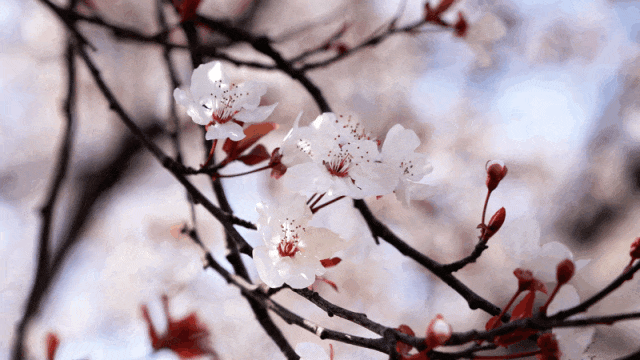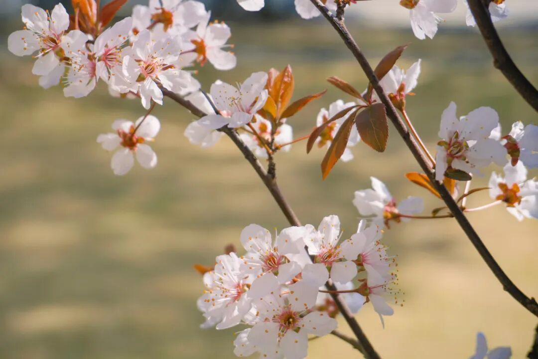 “三月风光一岁无,杏花欲过李花初。”学校里的紫叶李种植很多,可以作为李属的春花代表。紫叶李花叶同放,远看如一片淡粉紫色的烟雾。