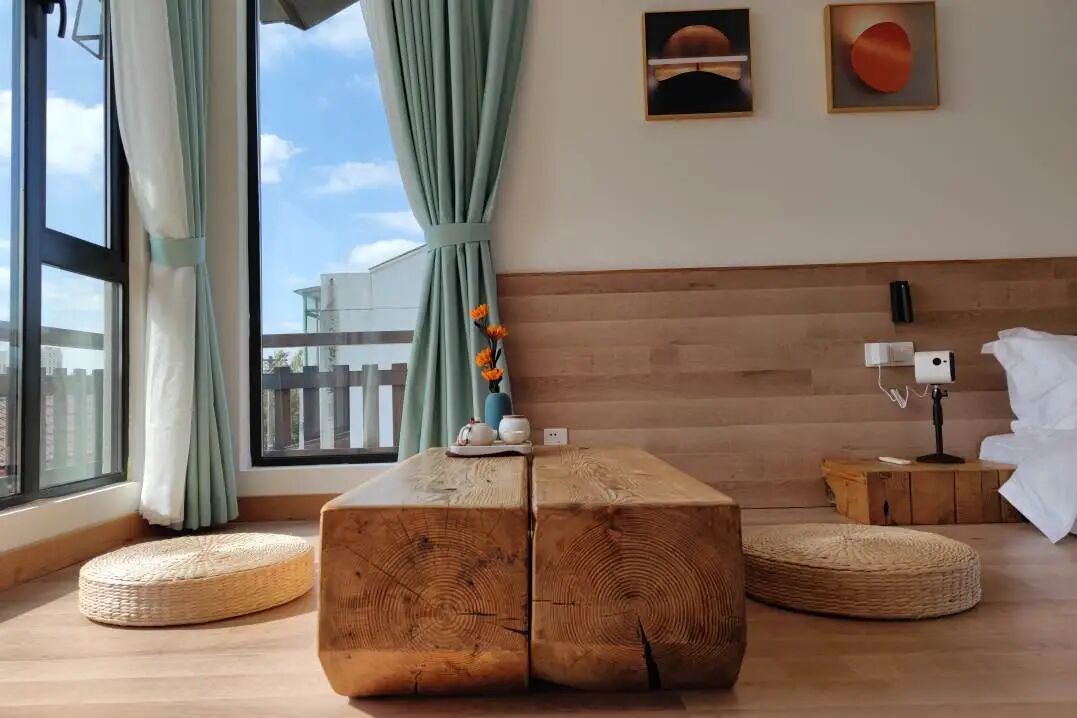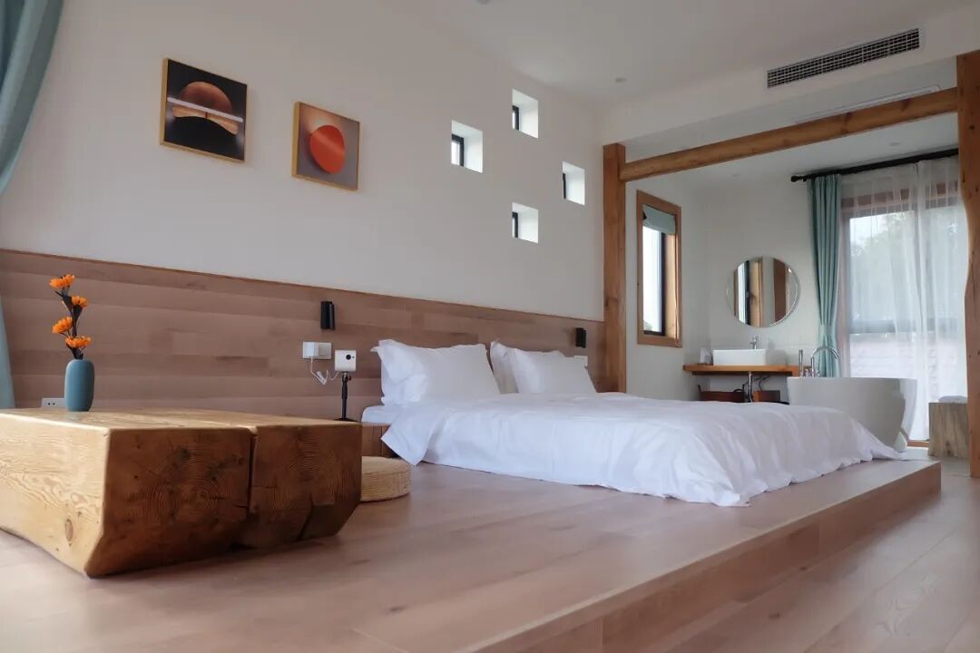 除了颜值出众的餐饮与休闲设施,乡村马龙的住宿区域也十分亮眼。民宿一期设有6间客房,均采用原木风格装修,搭配温暖色系与极简现代化智能家居,推窗就是满目绿意,蝉鸣鸟叫相伴,真正实现“屋中看景,赏心悦目;景中看屋,悠然自得”的惬意体验。