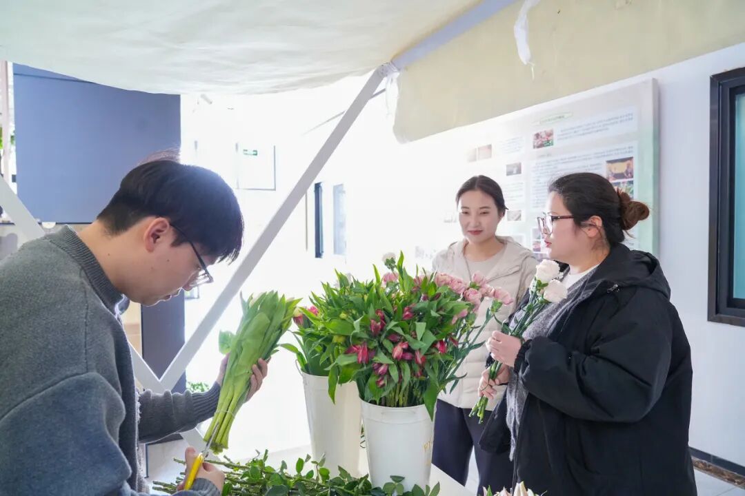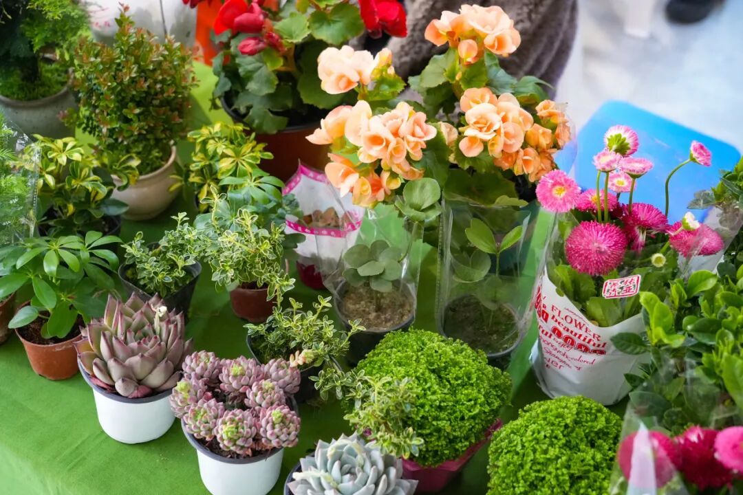 本次花木市集特设多个花卉展销专区,在法华村博麟花卉展区,康乃馨、百合、玫瑰等十余种优质鲜花竞相绽放,打造出氛围感满满的“柘片花海”,成为市集打卡热门点位。同时,盆彩万象专区准备了多款适合家庭养护的绿植小盆栽,搭配专属养护须知,让新手也能轻松养好绿植。悠春花坊摊位前,花艺师现场坐镇,耐心为市民讲解花卉寓意、提供专属鲜花搭配服务。不少市民边听边挑选,很快就挑选出心仪的花束。