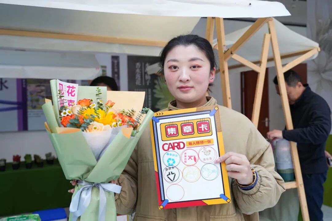 此外,本次市集打破了传统展销模式,融入趣味科普互动环节,让大家在游玩购物的同时,学习生态环保、绿植养护知识,传递绿色文明理念。在“绿护百科 智趣问答”和“见‘圾’行事 快问快答”两大互动区域,设置了趣味答题环节。围绕植物种植养护等知识,以及各类垃圾分类知识点,让参与者随机抽取题目作答,答对即可积攒印章,集满6枚印章,还能免费兑换一束鲜花。