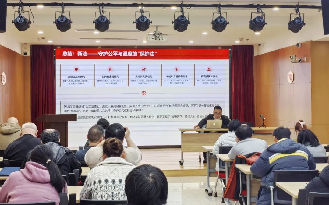 本次培训邀请上海市君和律师事务所律师董旭东担任主讲,以“邻里有‘法’ 生活安心——新《治安管理处罚法》亮点解读”为主题,结合社区调解工作实际,重点讲解了养犬管理责任、正当防卫与互殴的区分认定、高空抛物治理、无人机“黑飞”治理、未成年人违法处罚等与居民日常生活息息相关的热点条文。