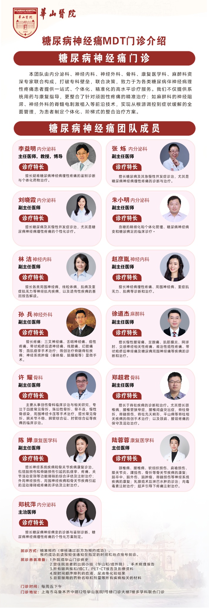 在家人的推荐下,张阿姨前往华山医院“糖尿病神经痛多学科联合门诊”,一间诊室内,内分泌、神经内科、神经外科、疼痛科、骨科、康复医学科六位专家联合坐诊,一次性梳理病史、完成查体、联合会诊,全程不用患者再辗转转诊。