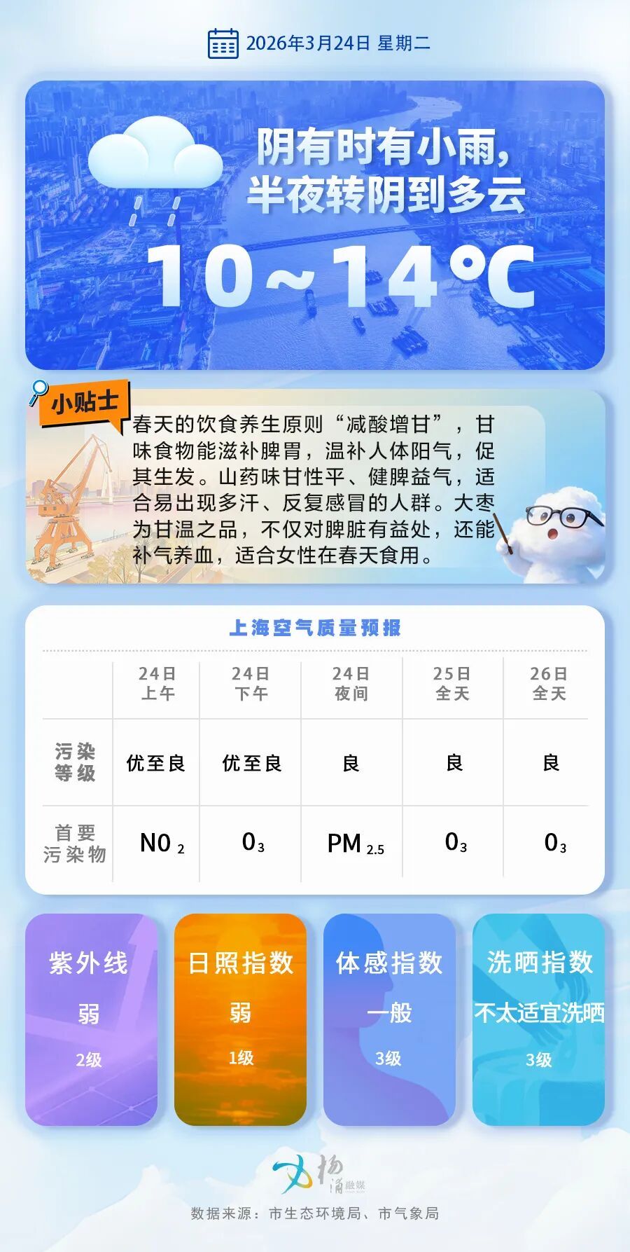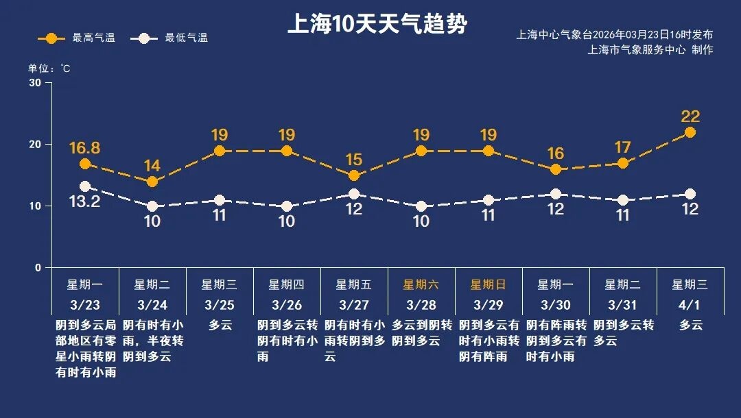 西南暖湿气流活跃,本周申城的天气在多云、阴天和雨水中切换。主要降水过程出现在周四夜里至周五白天和周日前后。本周最低气温稳定在10~12℃,最高气温略有起伏,周中和双休日的最高气温预计都在19℃,体感整体偏暖湿;周五伴随着雨水,最高气温下降至15℃。春季天气反复多变,提醒大家多多关注临近天气变化。