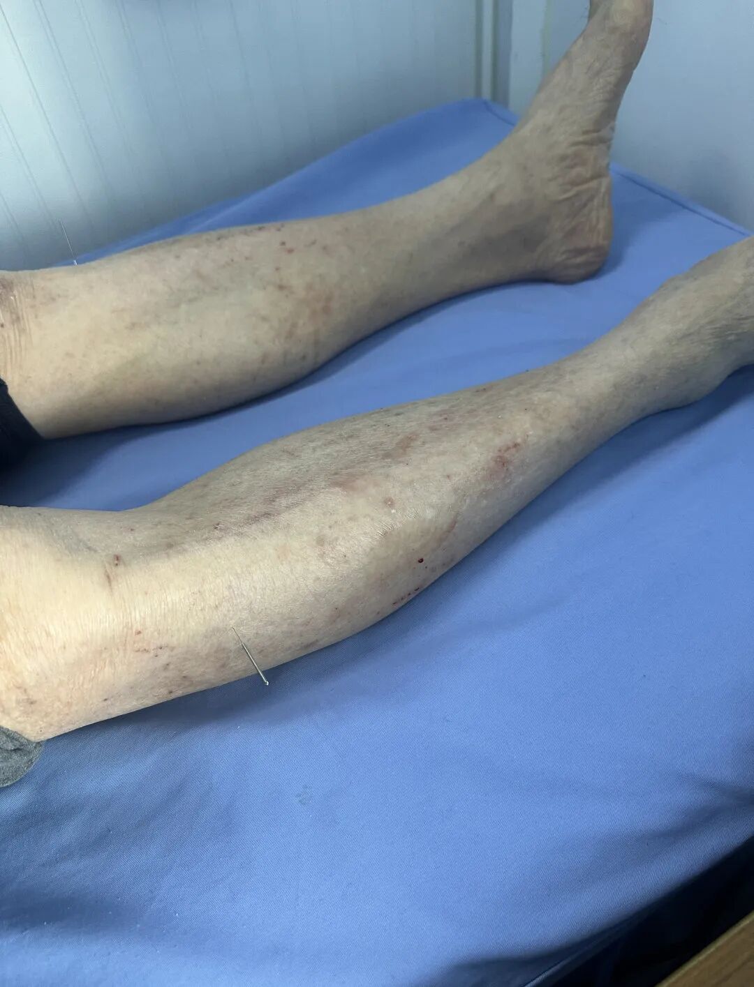 专科检查(皮损):双侧小腿伸侧可见对称性、境界不清的片状红斑,其上密集粟粒至米粒大小红色丘疹、丘疱疹,部分融合成片,多处见抓痕、糜烂面,有淡黄色清亮渗液,局部覆盖淡黄色痂皮。皮损周围轻度肿胀。