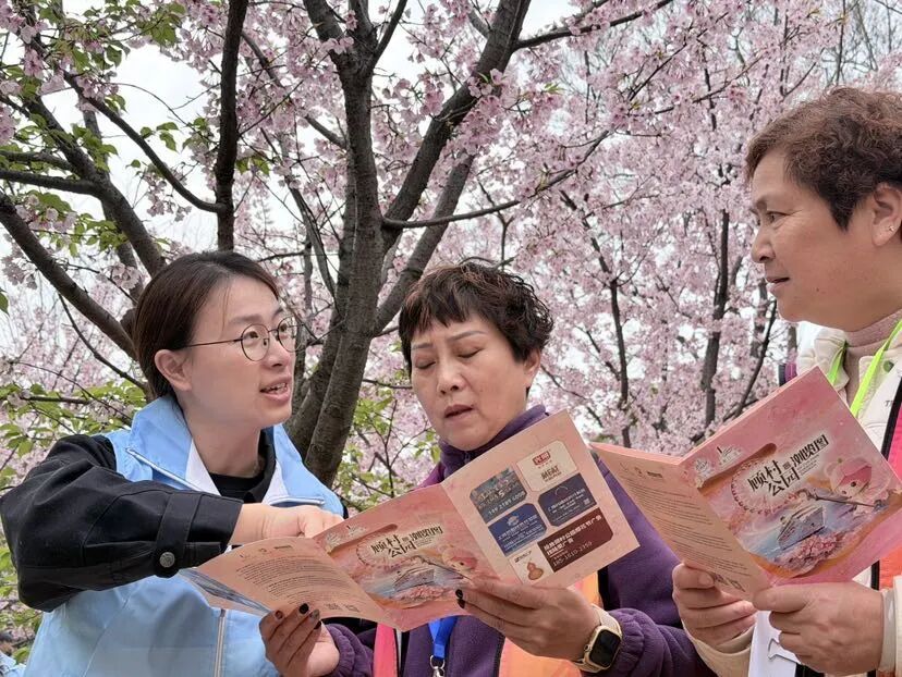 “青之樱”志愿服务队、“幸福顾村”青年突击队和房产公司的青年代表们,按照“一条打卡路线、多个特色点位”的布局,分散在园内各个打卡点,开启全方位志愿服务模式。
