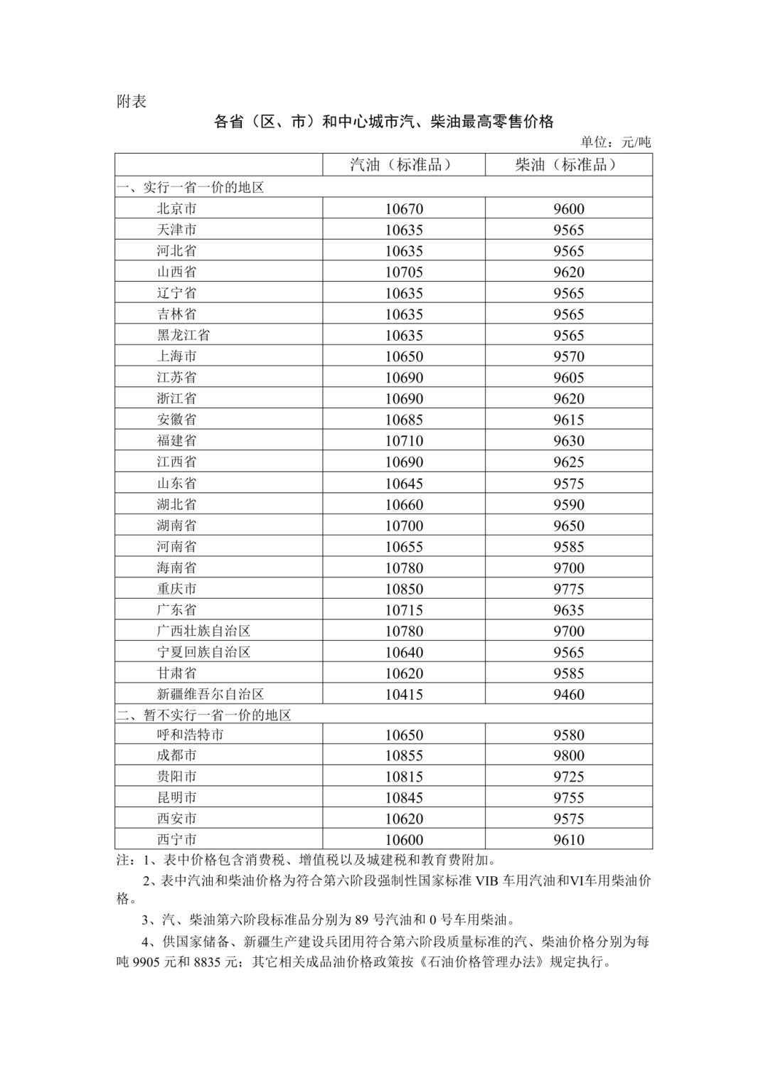 汽、柴油最高零售价格